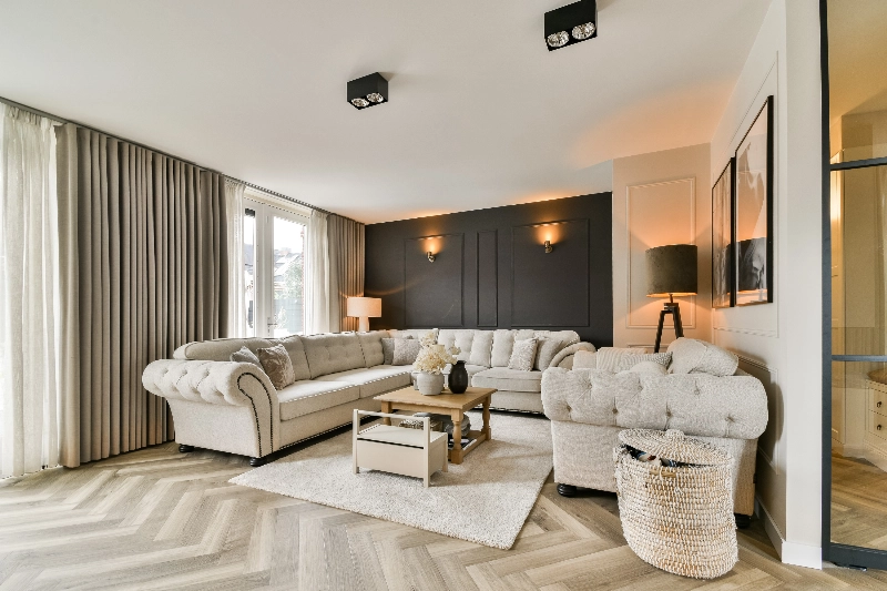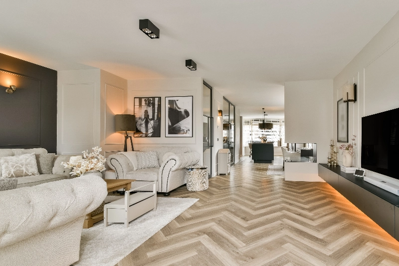 Via de openslaande Gers-deuren met vaste ramen bereik je de woonkamer. Wat een heerlijke ruimte! Het zijraam geeft extra daglicht en de in visgraat gelegde PVC vloer geeft samen met de lambrisering en strak afgewerkte plafond een mooi geheel.