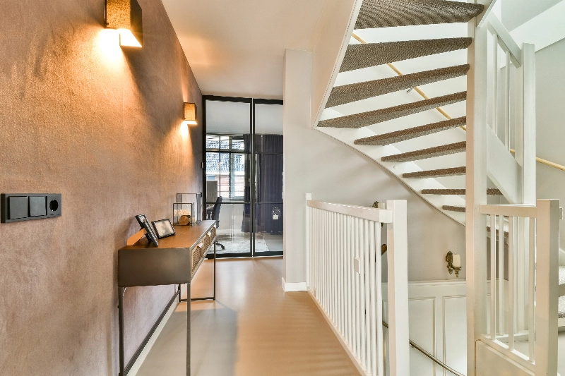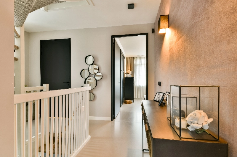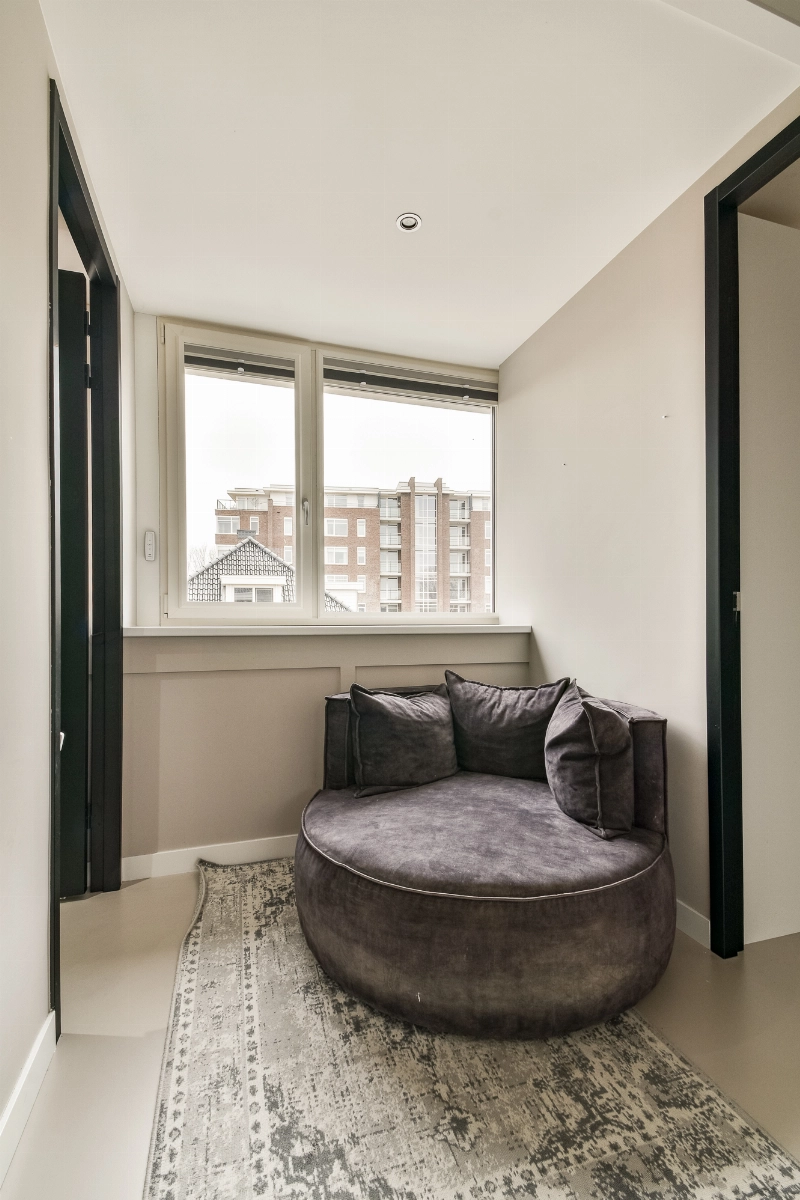 Via de fraaie trap bereik je de overloop met een 2e toilet. Dit toilet is op dezelfde wijze als het toilet op de begane grond afgewerkt. De indeling van deze verdieping is aangepast waardoor een luxe geheel is ontstaan. De vloer is afgewerkt met een strakke gietvloer en alle wanden zijn strak gestuct of voorzien van een luxe behang. Er is een extra vaste kast gecreëerd.