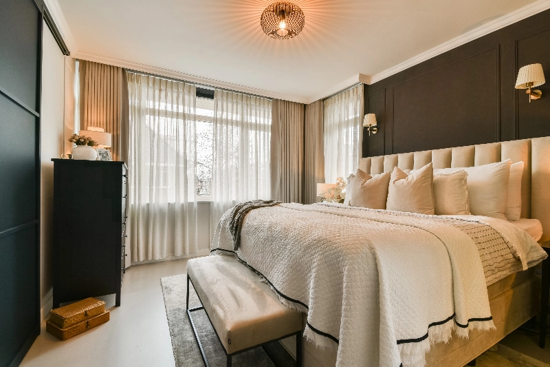 Slaapkamer I is gelegen aan de voorzijde en via de Gers- schuifdeur bereik je de aangrenzende kamer die thans volledig als kleedkamer is ingericht. De kastindeling inclusief kaptafel blijven dan ook achter. De badkamer ensuite bereik je via de schuifdeur in de slaapkamer en is werkelijk een wellness! Deze badkamer is luxe betegeld in combinatie met betonciré-stucwerk en heeft een breed eikenlook wastafelmeubel met dubbele waskom en een verwarmde en verlichte spiegel. De verouderde messingkranen bij de wastafel komen ook weer terug bij het vrijstaande bad en bij de inloopdouche met dubbele stortdouche. Het plafond is gestuct en voorzien van luxe, kleine spots.
