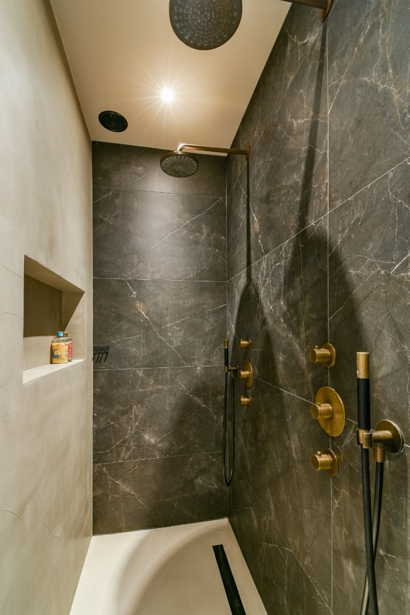 De 2e badkamer is afgewerkt met luxe betegeling, een inloopdouche met glazen wand, wastafelmeubel met verwarmde en verlichte spiegel en een 3e toilet.