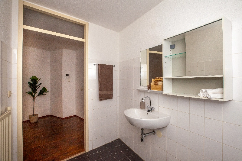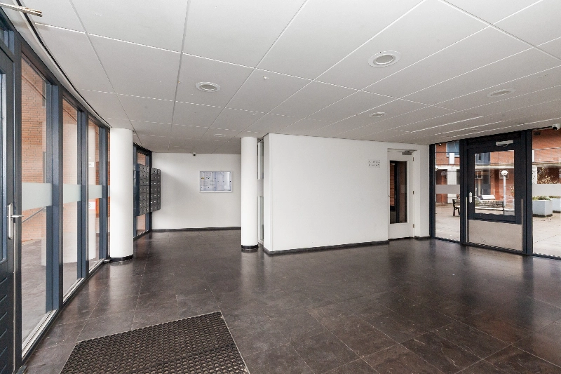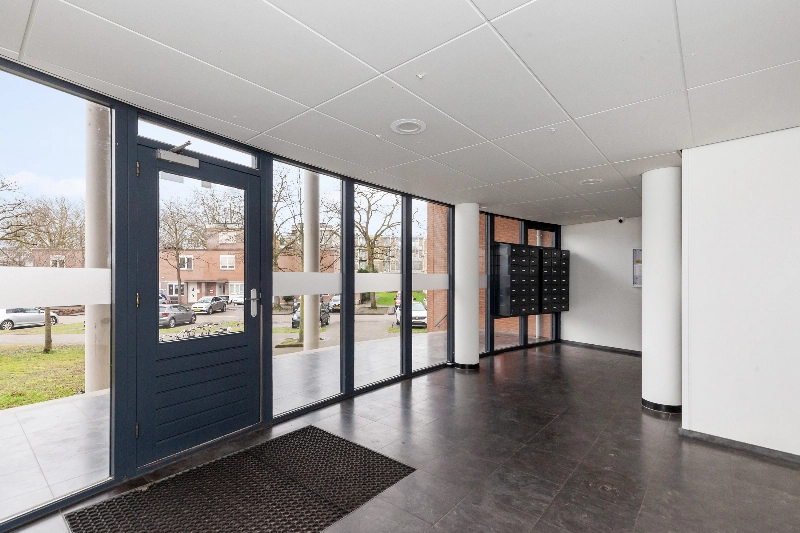 Je betreedt het complex via de gezamenlijke entree, met intercom, lift en brievenbus. De woning bevindt zich op de 1e verdieping.