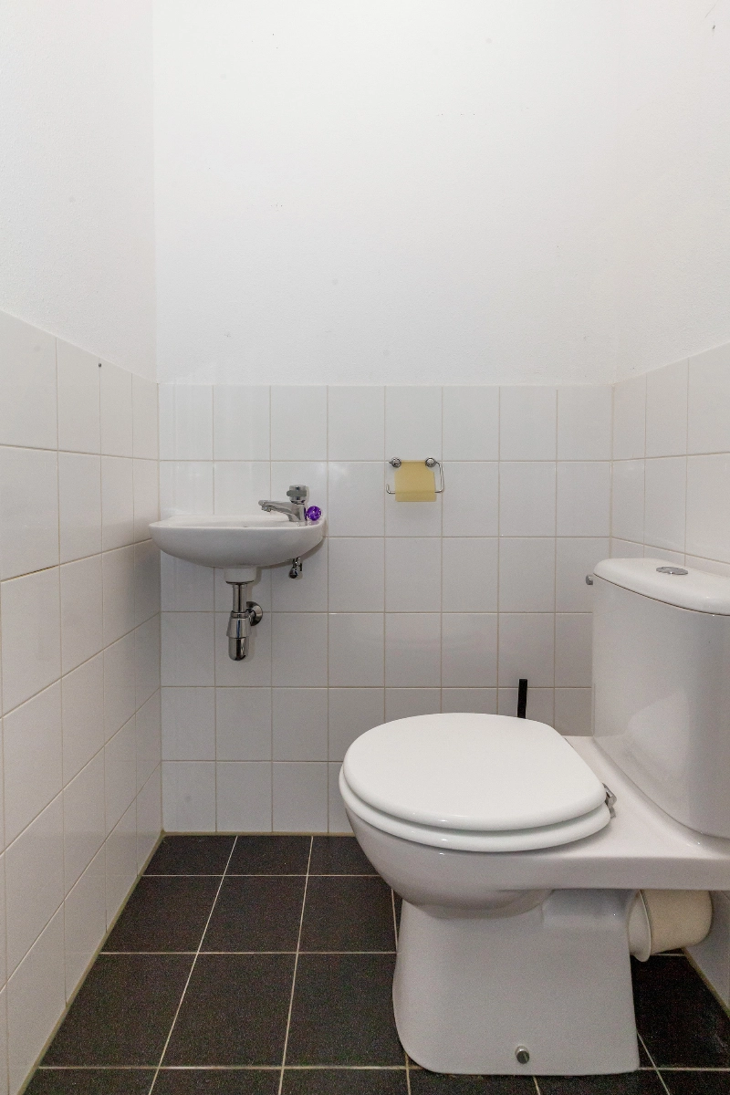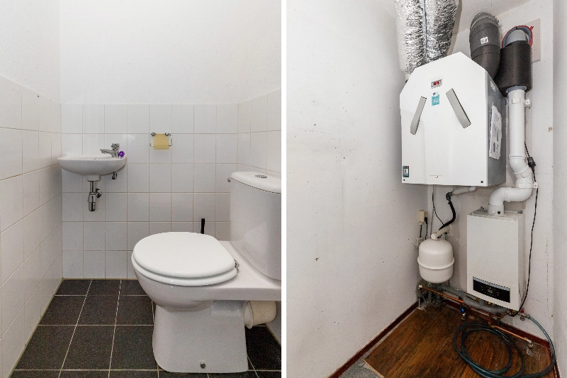 Zo kom je binnen via de royale hal met videofoon. In de hal is de gedeeltelijk betegelde toiletruimte, een mooie wasruimte met opstelplaats voor de wasmachine , ventilatie en CV. Hier vind je ook de meterkast.