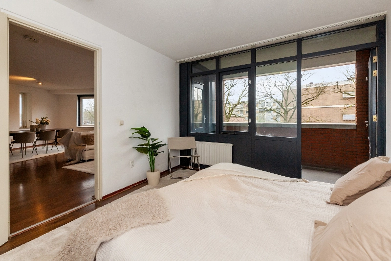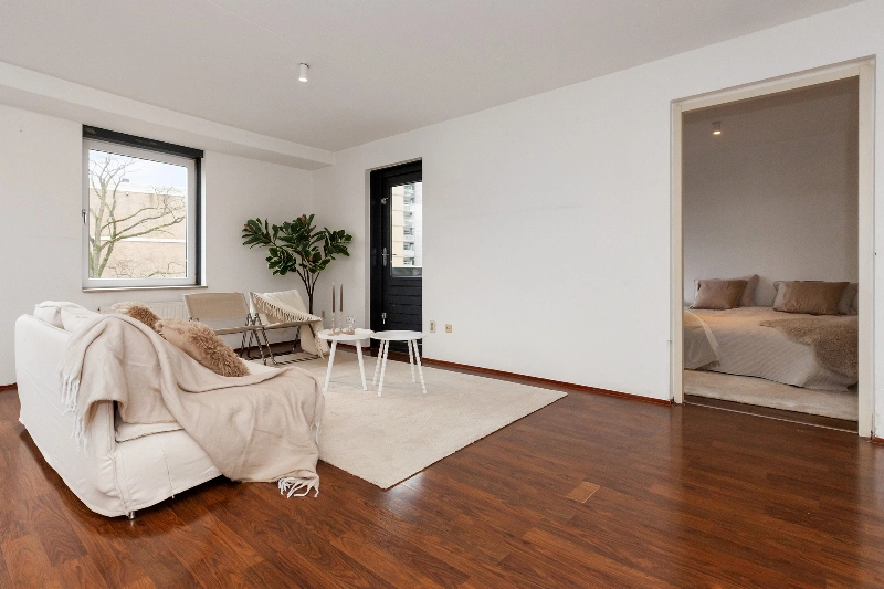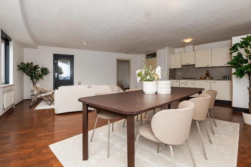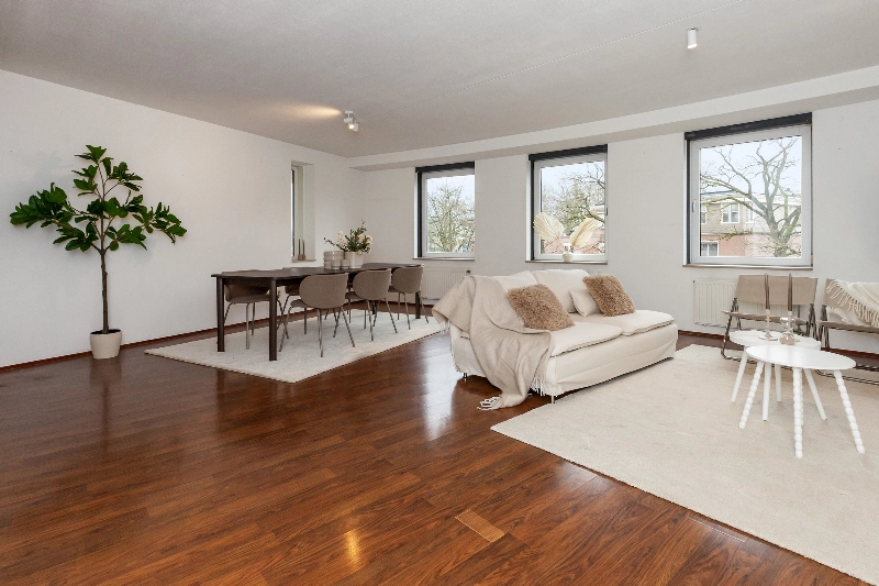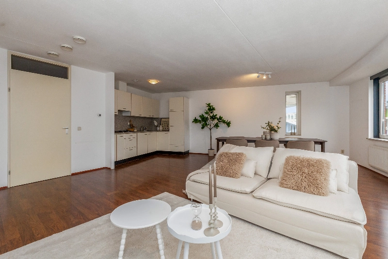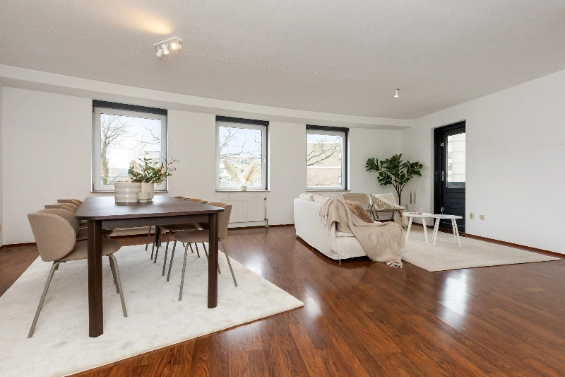 Wat een heerlijke ruime woonkamer! Grote ramen zorgen voor veel natuurlijk daglicht en de open indeling biedt volop mogelijkheden voor het creëren van een gezellige zithoek en een aparte eethoek. Er is een deur naar het ruime balkon. Hier kan je genieten tijdens de warme dagen.