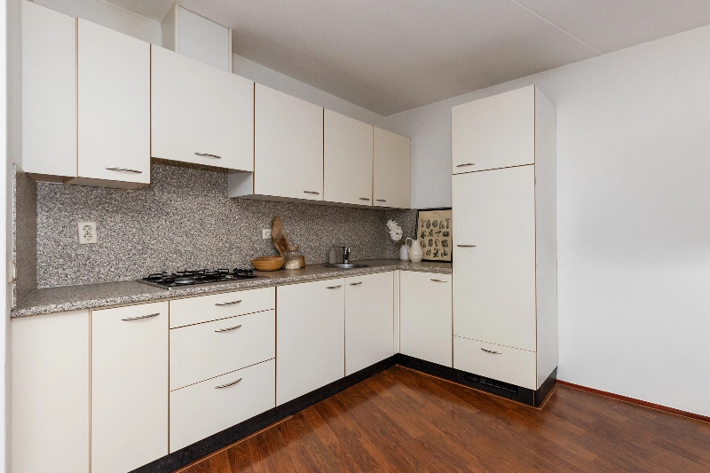 In de woonkamer vind je een open keuken. De witte hoekopstelling is keurig en voorzien van een koelkast, afzuigkap, 4 pits gaskookplaat en een kunststof aanrechtblad. Er is voldoende opbergruimte door de vele kastjes.