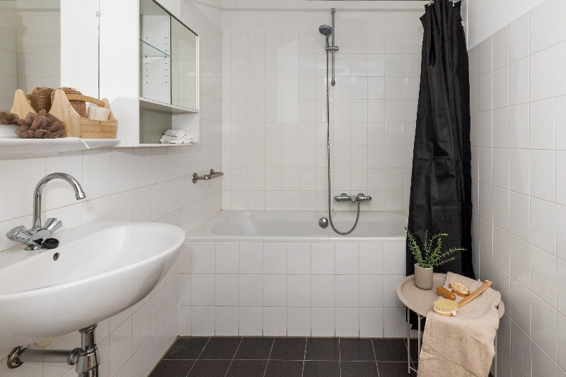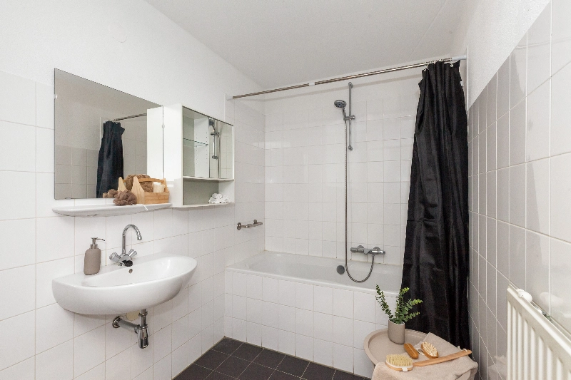 De keurig afgewerkte badkamer is voorzien van antracietkleur vloer- en witte wandbetegeling en afgewerkt met een ligbad met doucheopstelling, een wastafel met spiegel en een radiator.