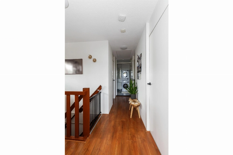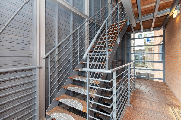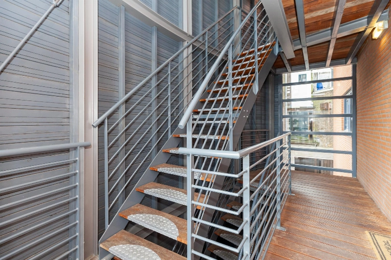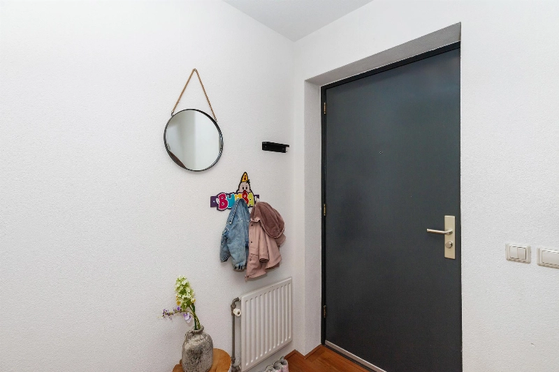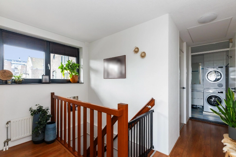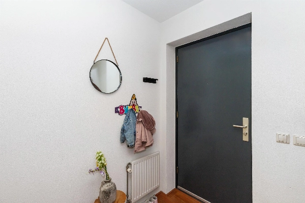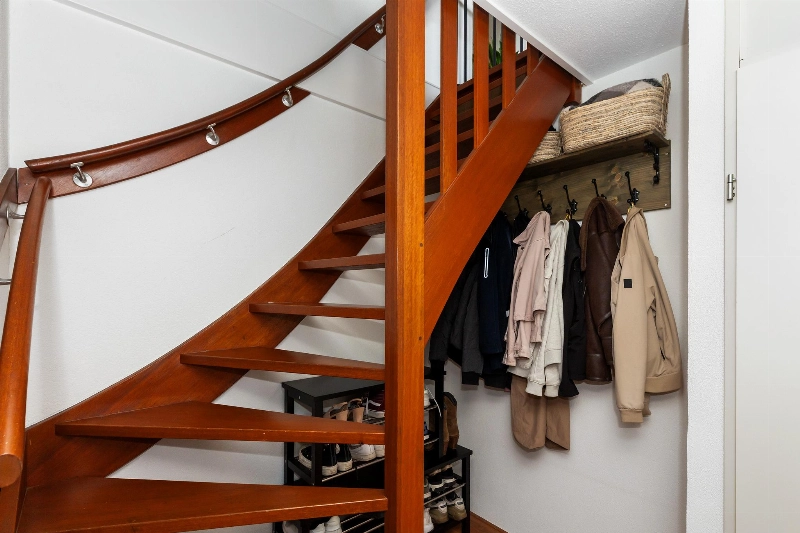 De entree van het appartement bevindt zich op de tweede verdieping. U komt binnen in een ruime hal met garderobe, een diepe kast en de hardhouten trap naar het woongedeelte op de derde verdieping.