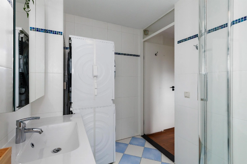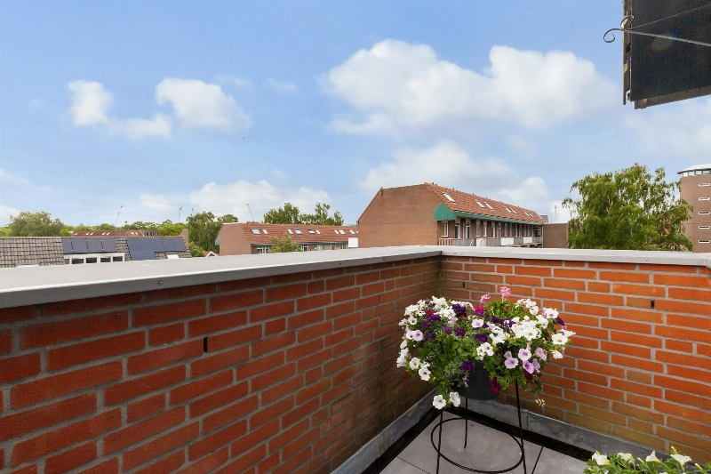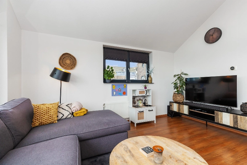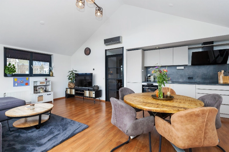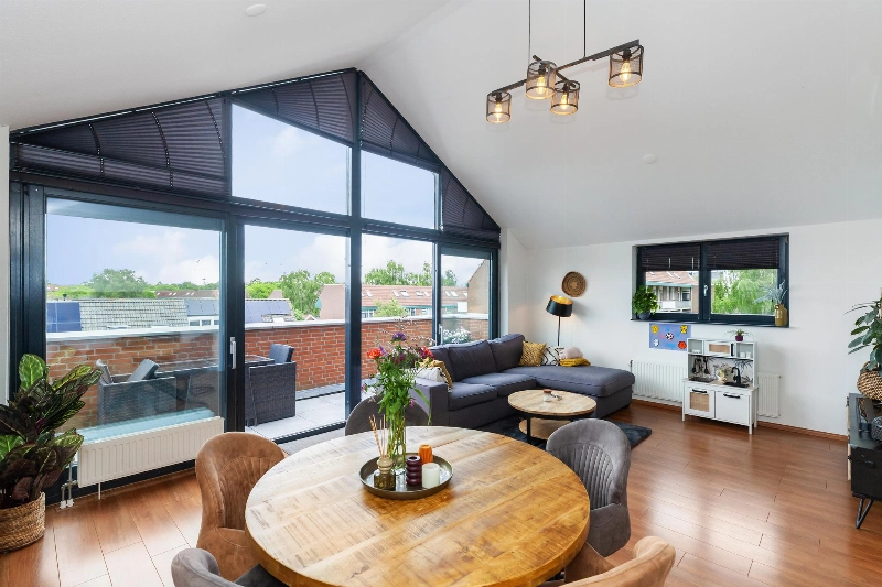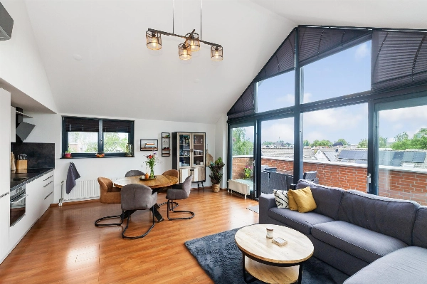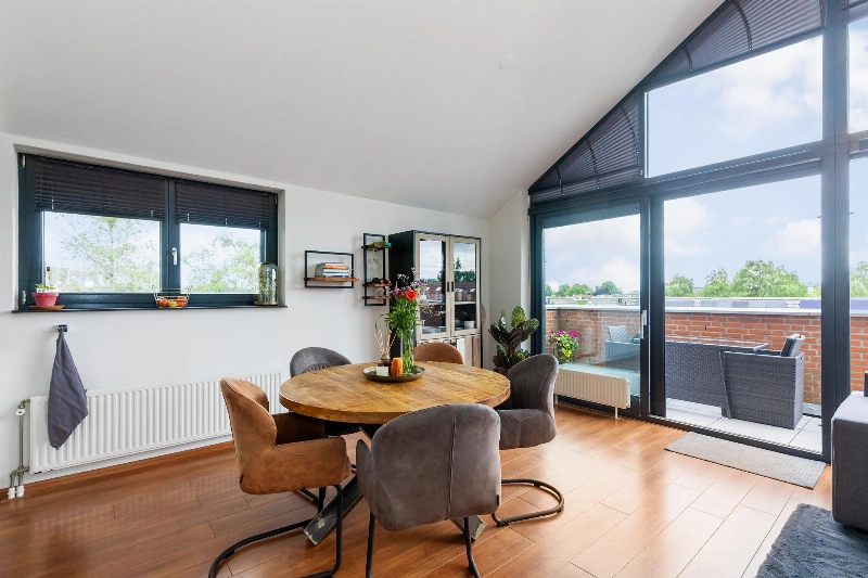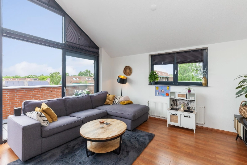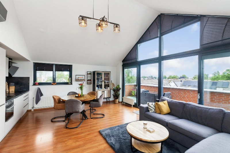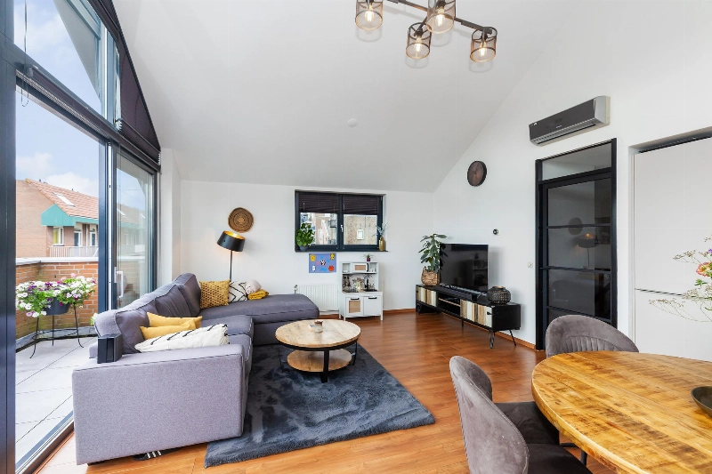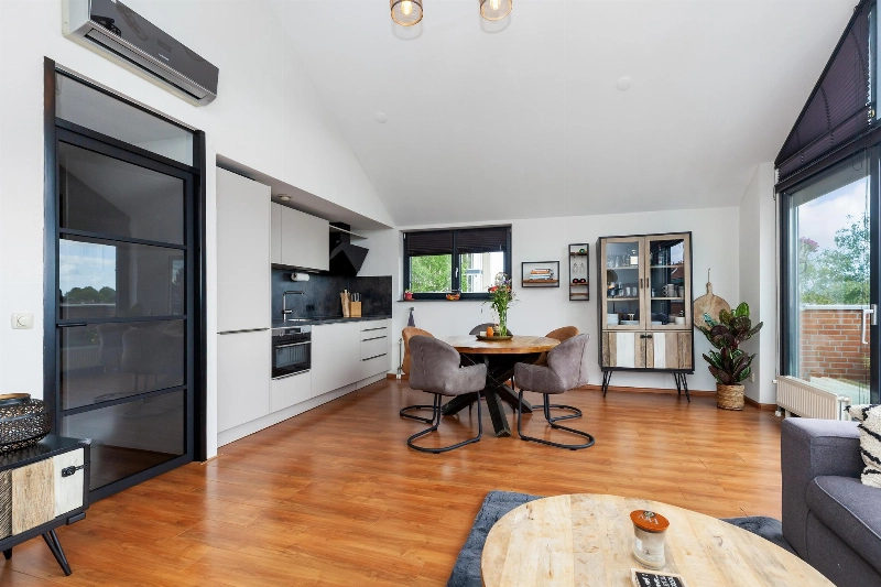 Recht van de overloop komt u via een stijlvolle zwarte deur met rookglas in de royale woonkamer. Het hoge plafond springt direct in het oog en de aanwezige airco zorgt voor een aangenaam binnenklimaat. Op de vloer ligt een kersen laminaatvloer welke doorloopt in het gehele appartement. De grote glazen pui met schuifpui is een echte eyecatcher en laat veel daglicht binnen. Op het aangrenzende terras liggen lichtgrijze keramische tegels. Dit is echt een fijne plek om van het buitenleven te genieten en uit te kijken over de wijk.