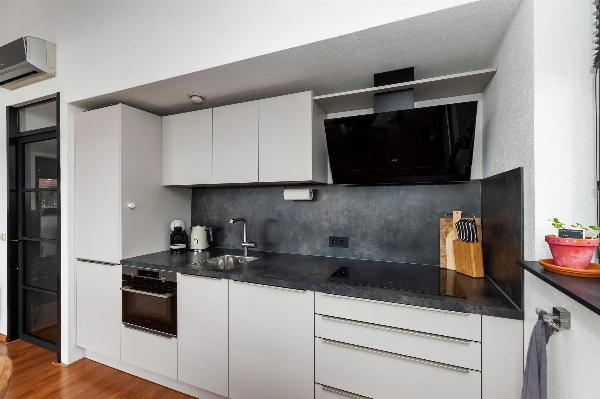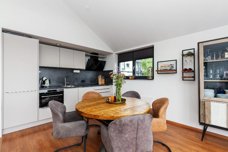 De nieuwe open keuken (2023) is uitgevoerd in een taupekleur en voorzien van een extra diep betonlook werkblad. De keuken is uitgerust met een inductiekookplaat, een glazen afzuigkap, een combi-oven, een koelkast, een vriezer en een vaatwasser.