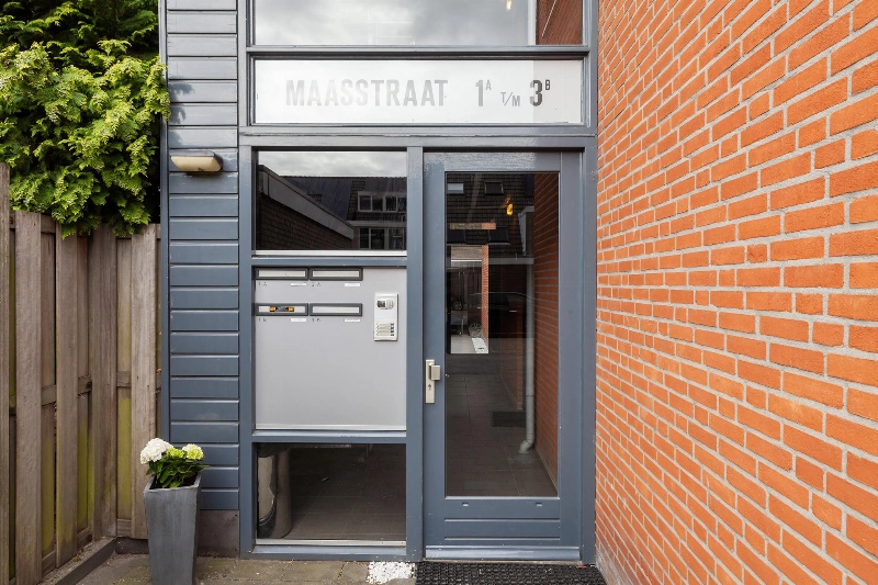 Afgesloten entree met brievenbussen en bellentableau. Centrale hal met de trapopgang naar de verdiepingen.