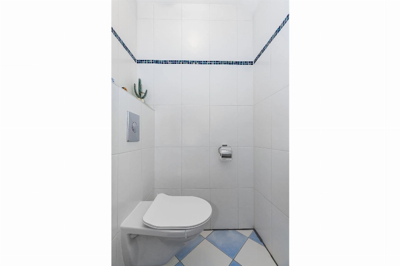Ruime overloop met een keurig betegeld toilet in het wit/blauw met een zwevend closet. In een aparte kast is de c.v. combiketel (Nefit) geplaatst.