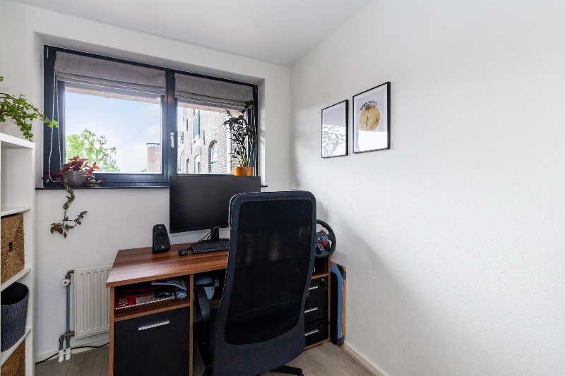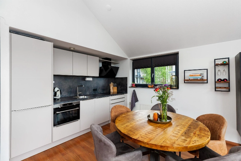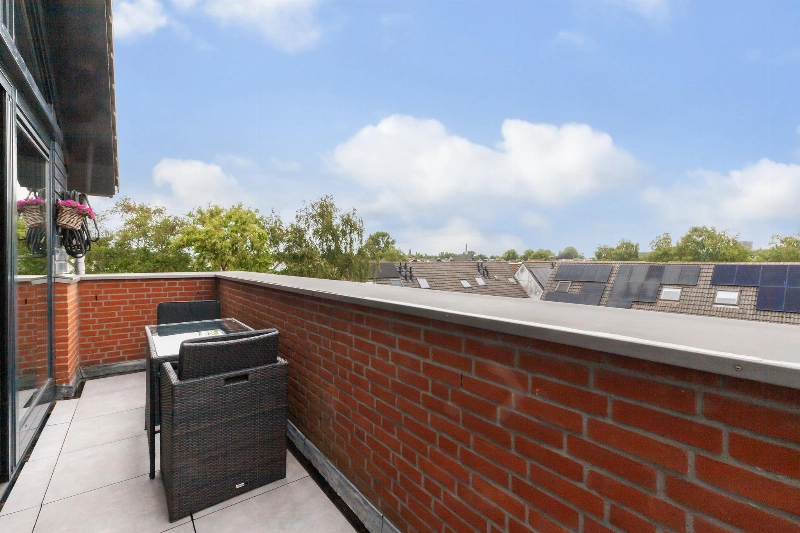 Het appartement is modern afgewerkt met een gloednieuwe open keuken (2023) in stijlvolle taupe tint, compleet met inbouwapparatuur. De woonkamer ademt een echt loftsfeer dankzij het hoge plafond van maar liefst 4 meter en de grote ramen met schuifpui naar het ruime terras. Dit is echt een hele fijn plek om buiten te zitten.