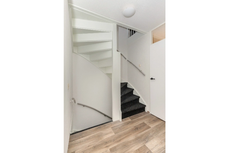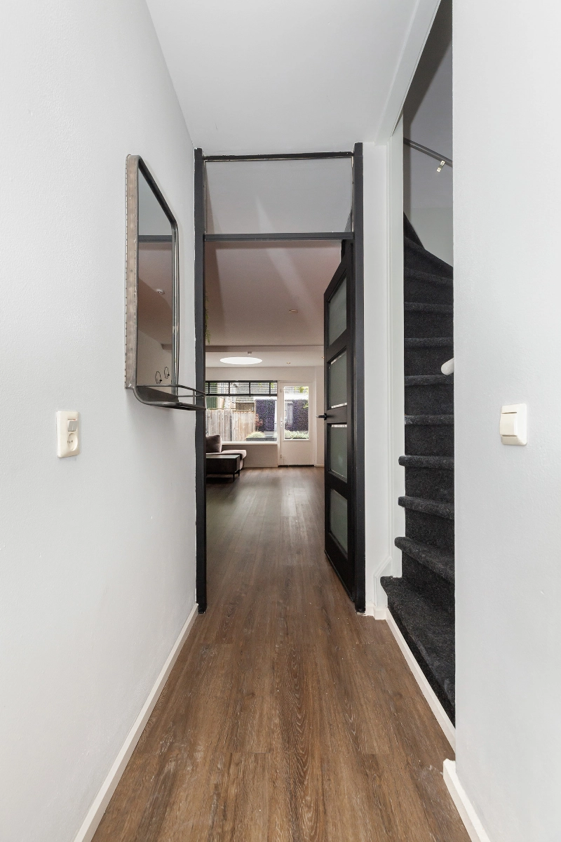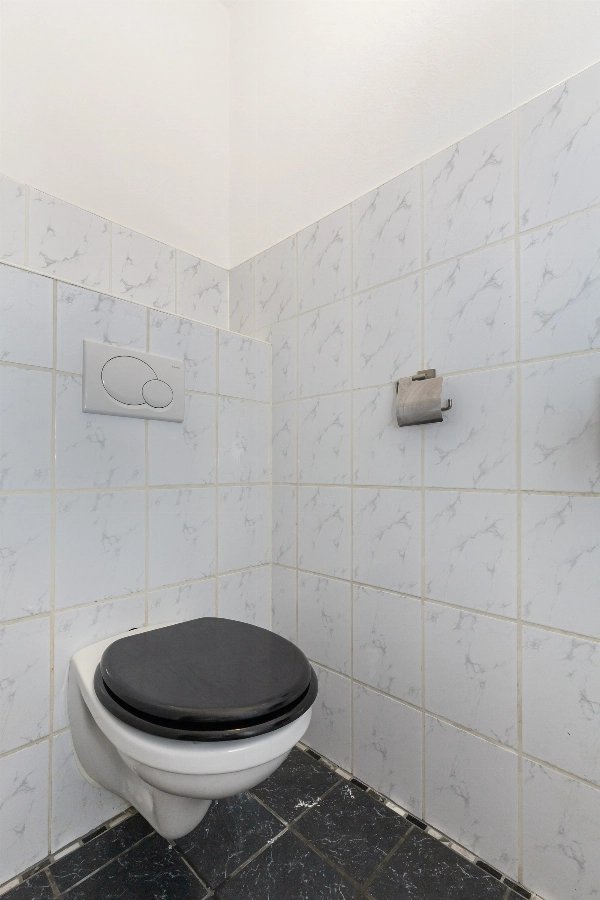 De entree van de woning is gelegen aan het autovrije pleintje. Je komt binnen in de hal met meterkast en keurig betegelde toiletruimte met wit/zwarte betegeling, een zwevend toilet en een fonteintje.