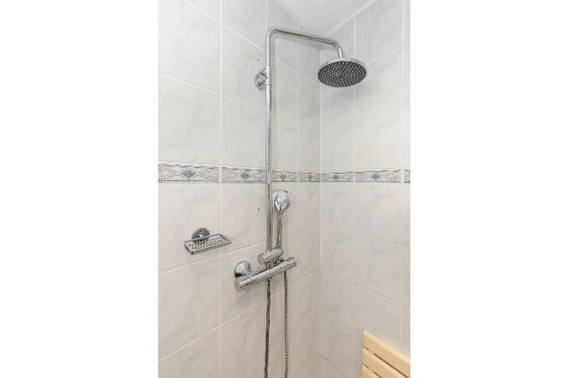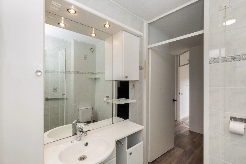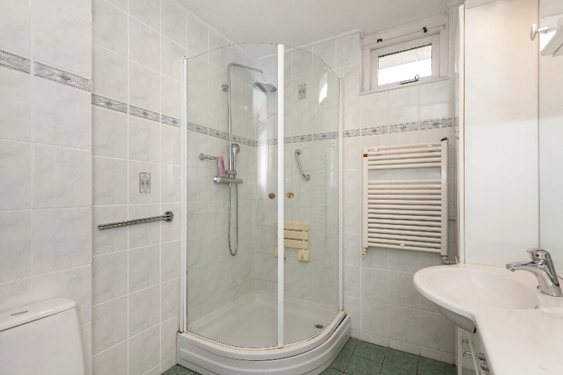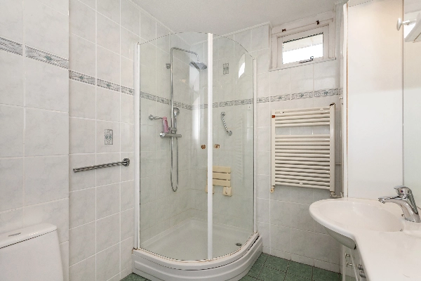 De badkamer is netjes betegeld met lichte betegeling en compleet met een halfronde douchehoek met glazen deuren, een wastafelmeubel, een handdoekradiator en een tweede toilet.