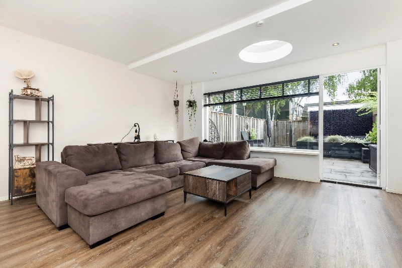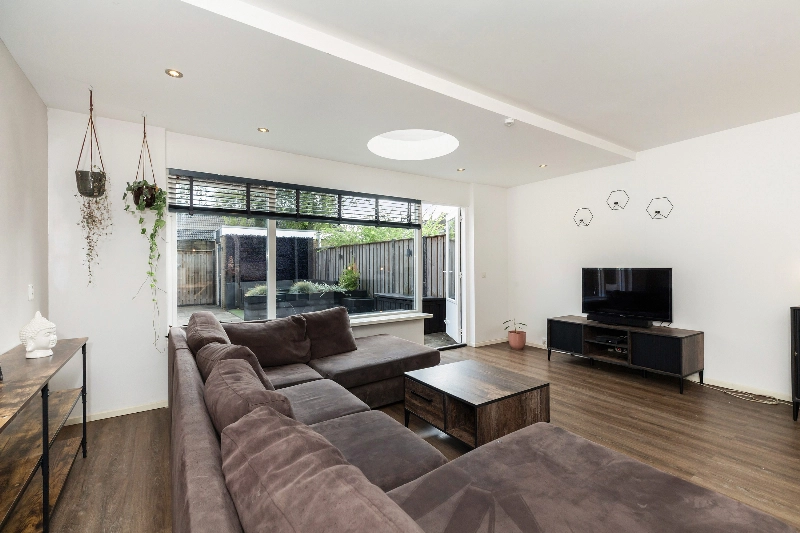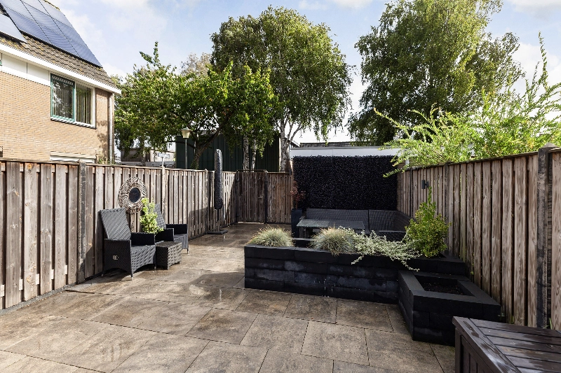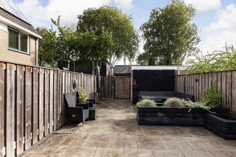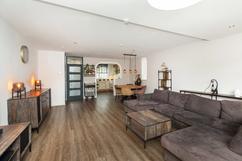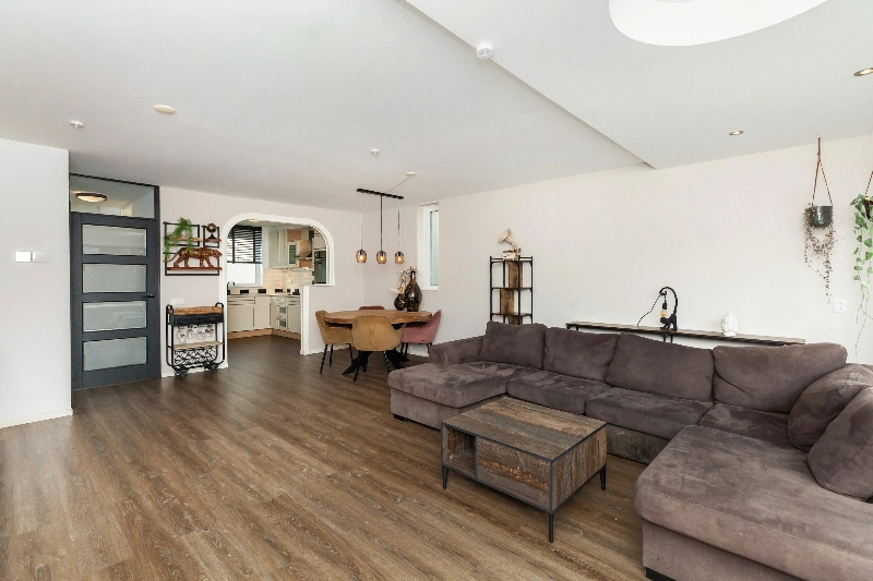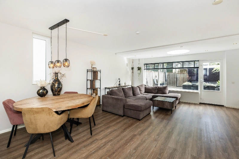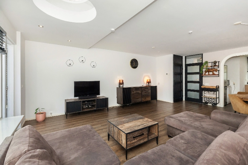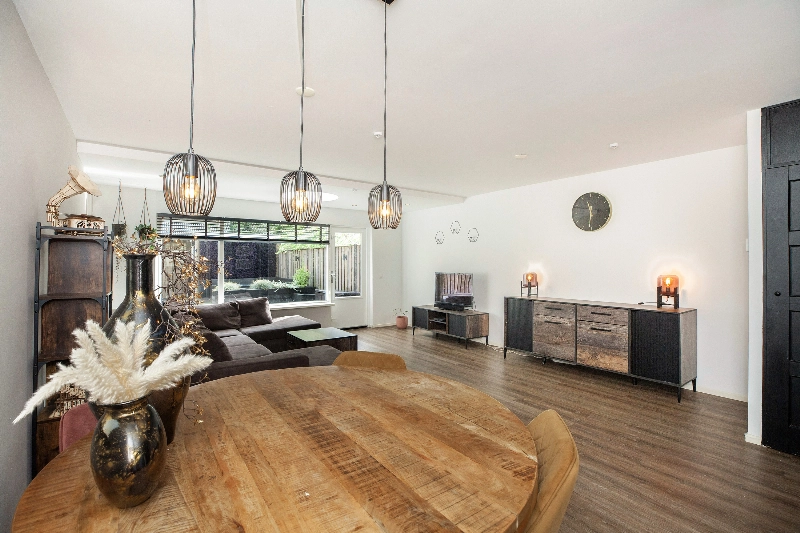 De mooie uitgebouwde woonkamer heeft een fijne lichtinval dankzij de lichtkoepel en het zijraam. Op de vloer ligt een mooie houtlook pvc-vloer met vloerverwarming welke is doorgelegd naar de keuken en hal. Vanuit de woonkamer bereik je de diepe op het oosten gelegen tuin. De tuin is ingericht met bestrating, kunstgras, sfeervolle plantenbakken en een stenen berging met elektra.