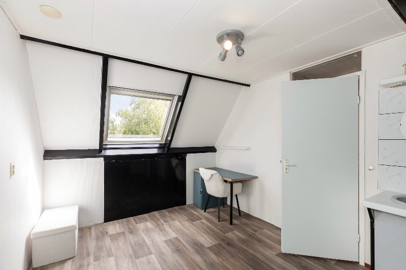 De grote zolderkamer heeft een groot dakraam, een wastafel met spiegel en praktische opbergruimte achter de knieschotten. Perfect als extra slaapkamer, werkkamer of hobbyruimte.