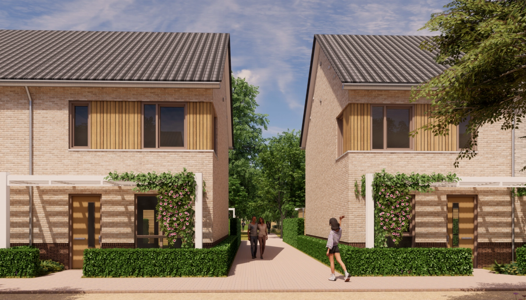 Type B. Dit betreft een rijwoning van 5.40m breed en is standaard voorzien van drie slaapkamers. In de voortuin komt een sfeervolle pergola en het Energielabel is A+++.