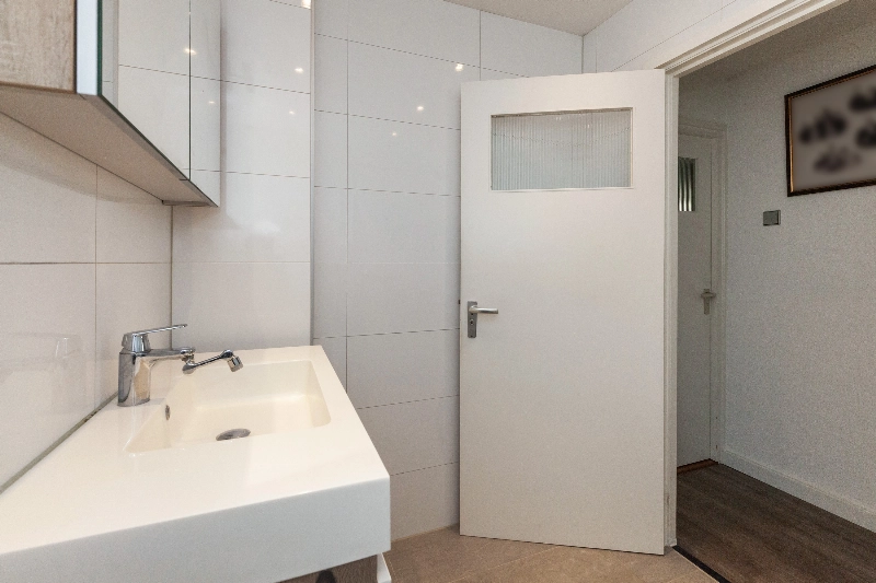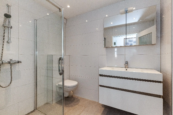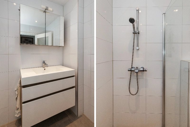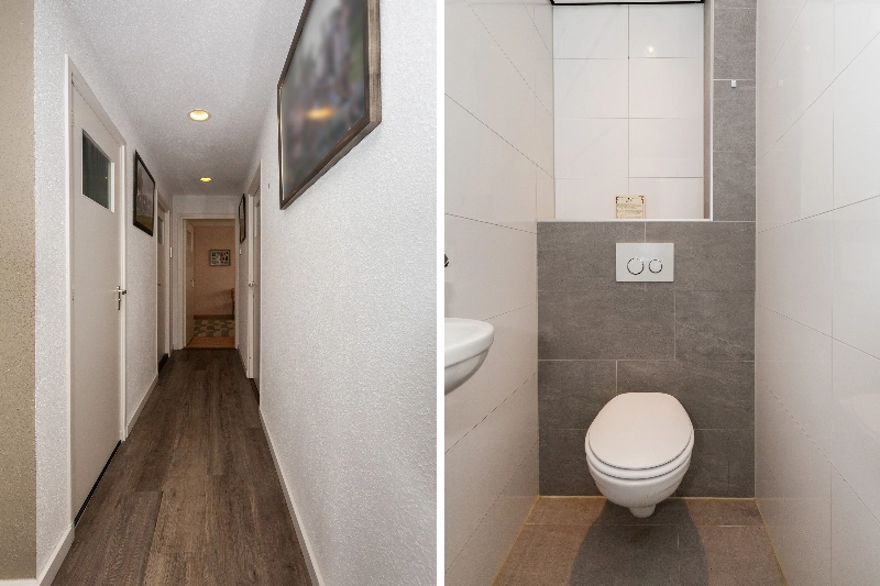 De moderne toiletruimte is volledig betegeld met grijze tegels en witte wand- en vloertegels en is voorzien van een zwevend toilet en fonteintje. De badkamer is eveneens volledig modern betegeld, met witte wandtegels en warm grijze vloertegels, en beschikt over een ruime inloopdouche met glazen wand, een modern wastafelmeubel met lades, een spiegelkast, een tweede toilet en automatische afzuiging.