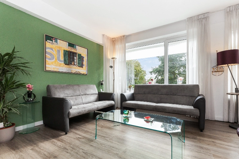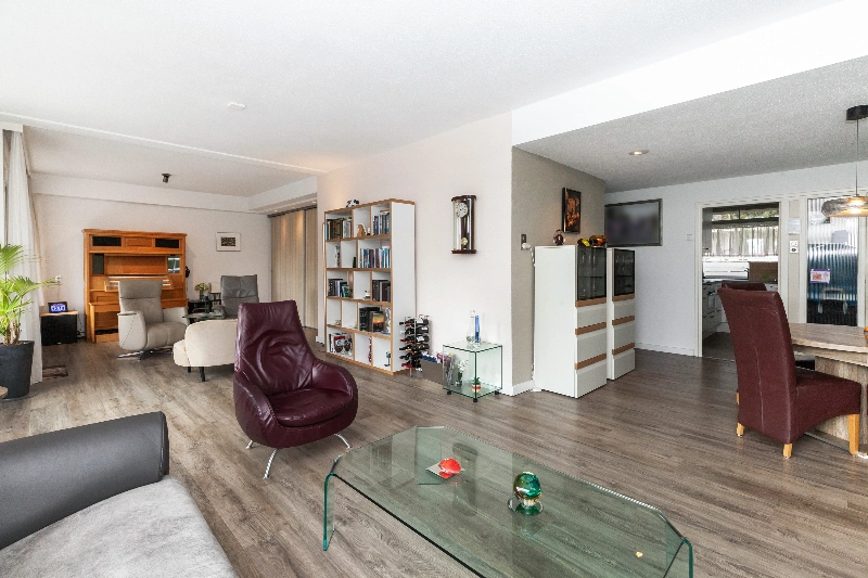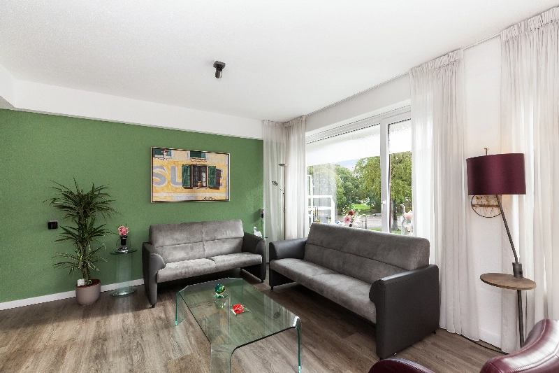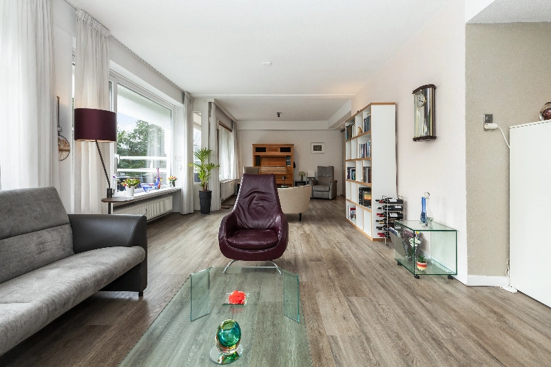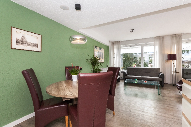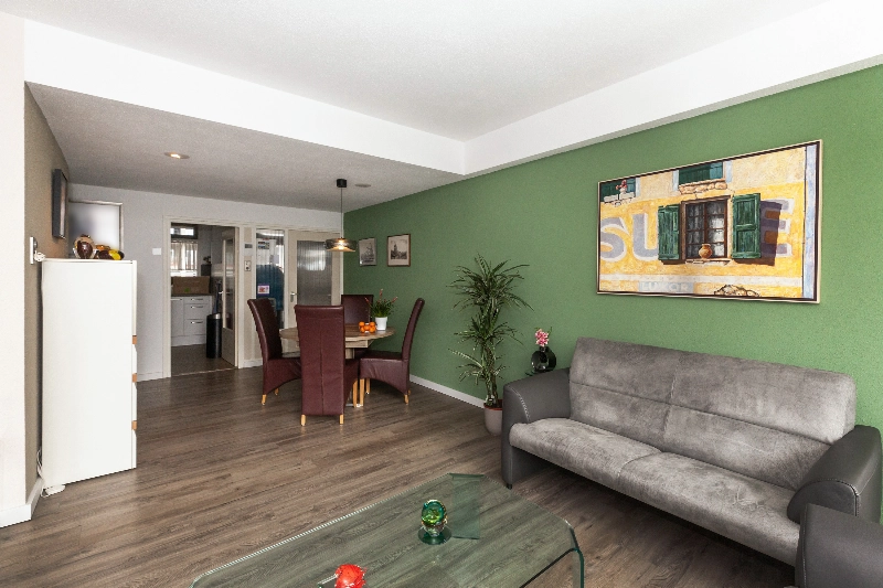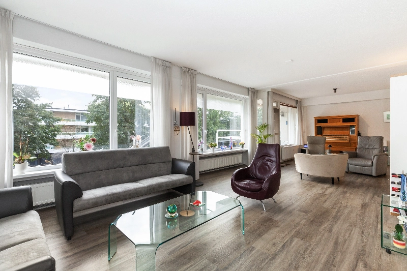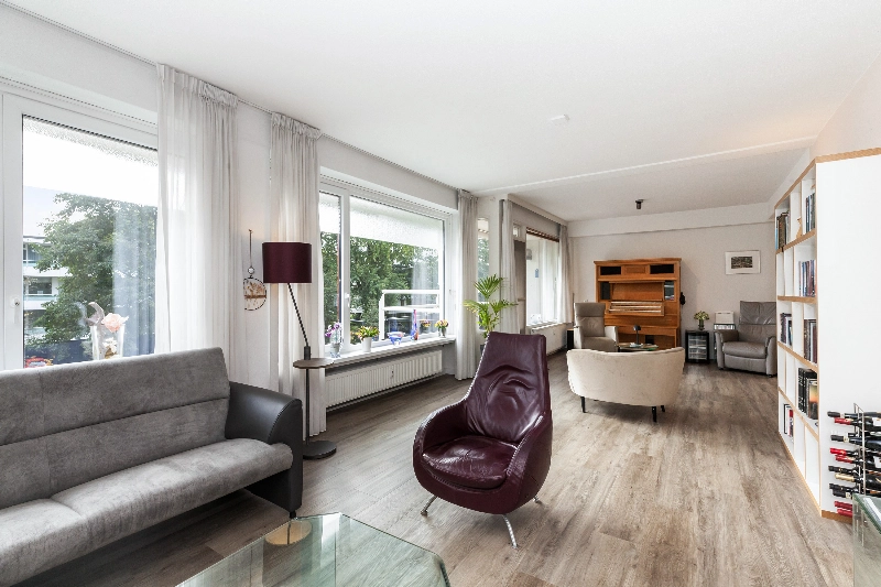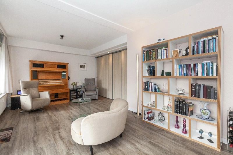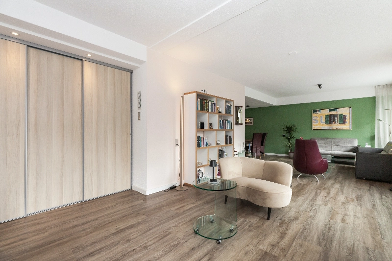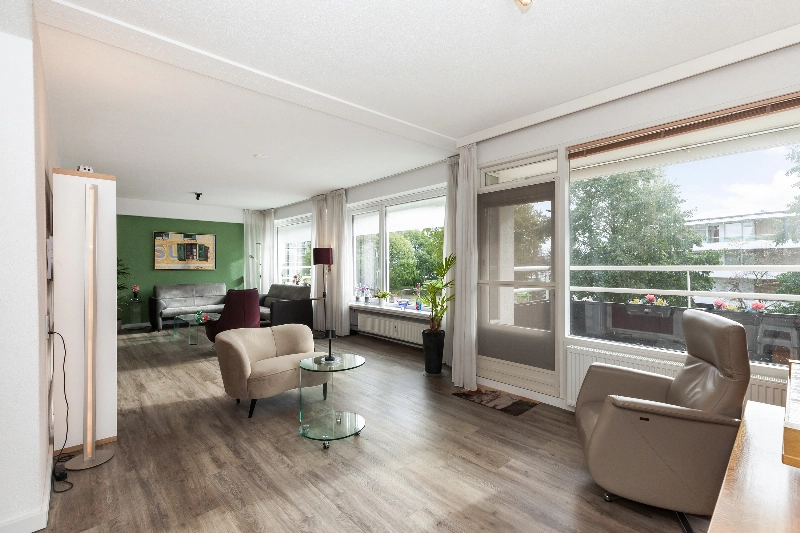 De woonkamer strekt zich uit over de volledige breedte van het appartement en wordt overspoeld met daglicht dankzij de royale raampartijen. De moderne houtlook laminaatvloer en kunststof kozijnen met HR++-glas (met zonwering) zorgen voor een moderne uitstraling en optimaal comfort. Achterin de woonkamer bevindt zich een fraaie kastenwand met geïntegreerde spotverlichting. Via de woonkamer stapt u zo het ruime, zonnige balkon op het zonnige zuiden op - compleet met elektrische zonwering. Hier geniet u in alle rust van het vrije uitzicht en de zon.
