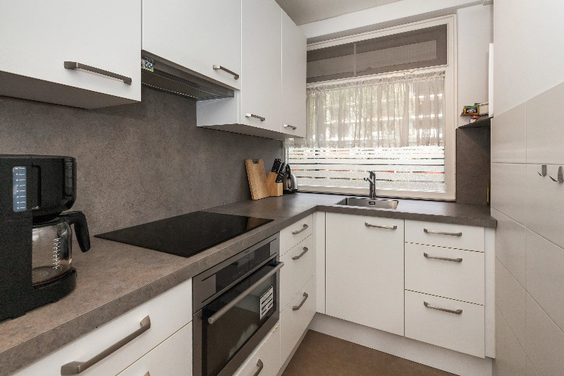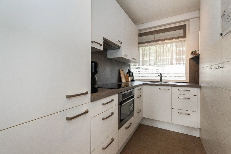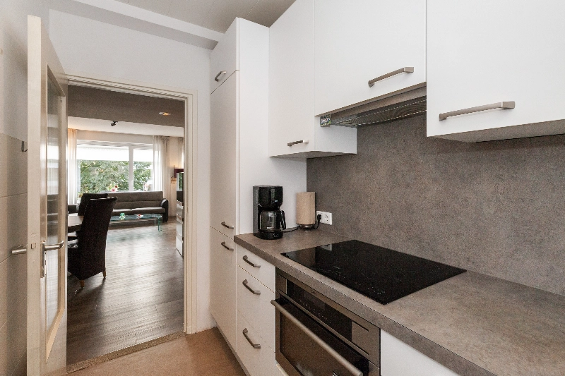 De moderne keuken is uitgevoerd in een fris witte kleurstelling met een stijlvol bruin/grijs werkblad en is voorzien van diverse inbouwapparatuur, waaronder een koelkast, vriezer, inductiekookplaat en combi-oven.