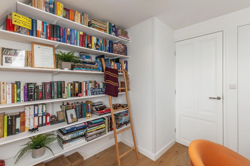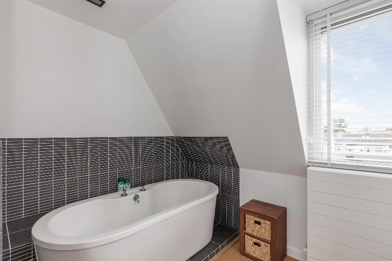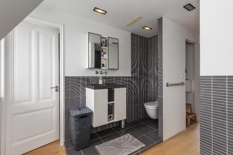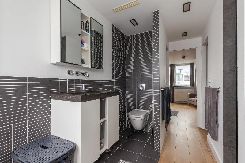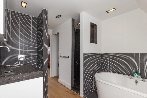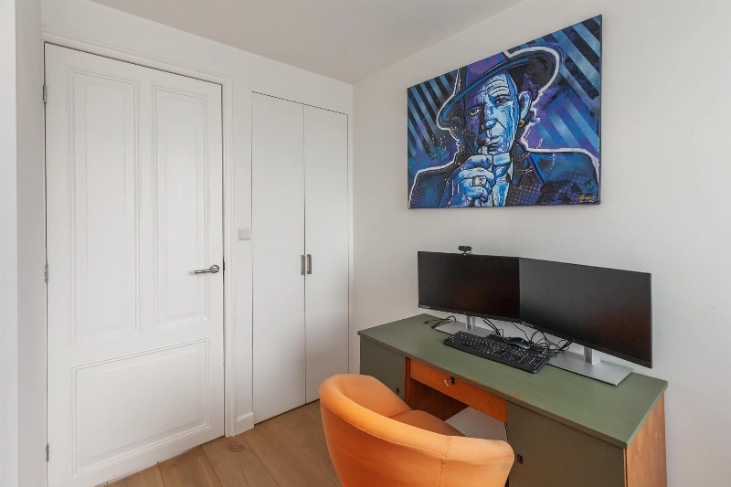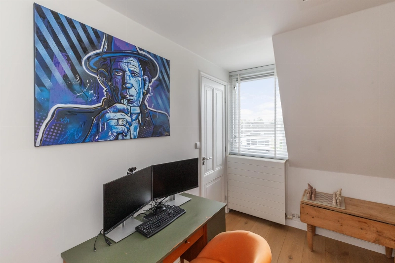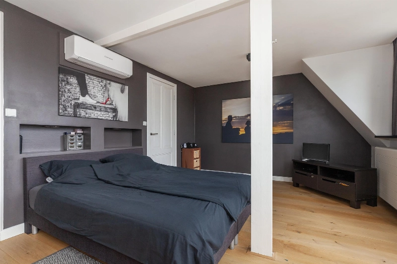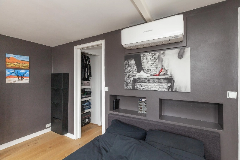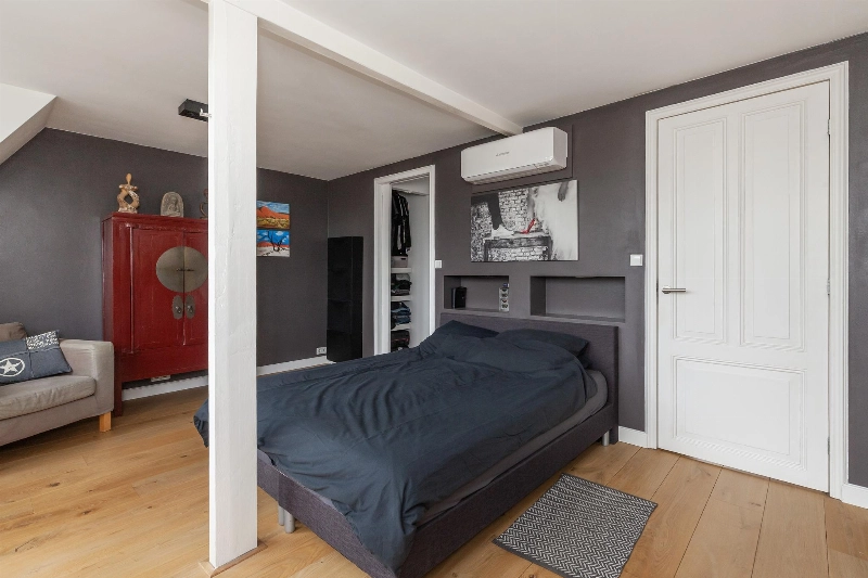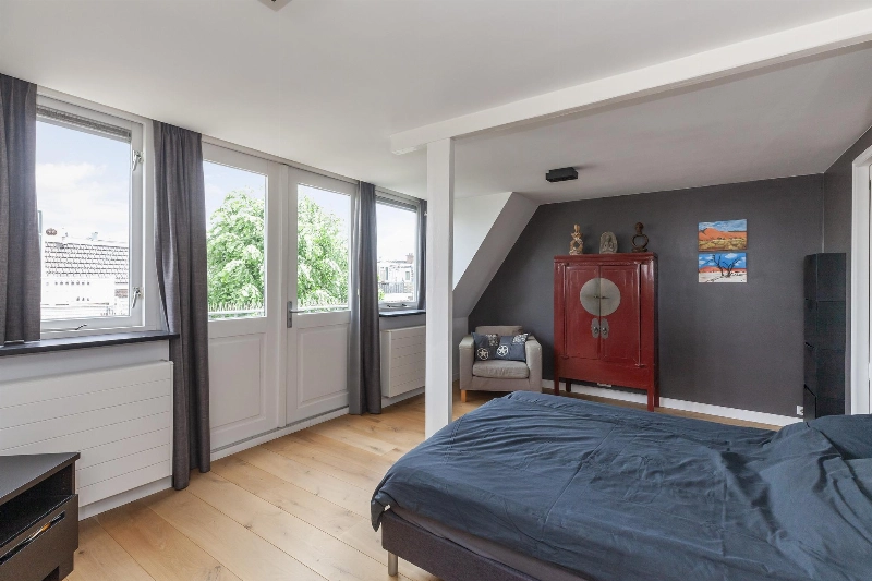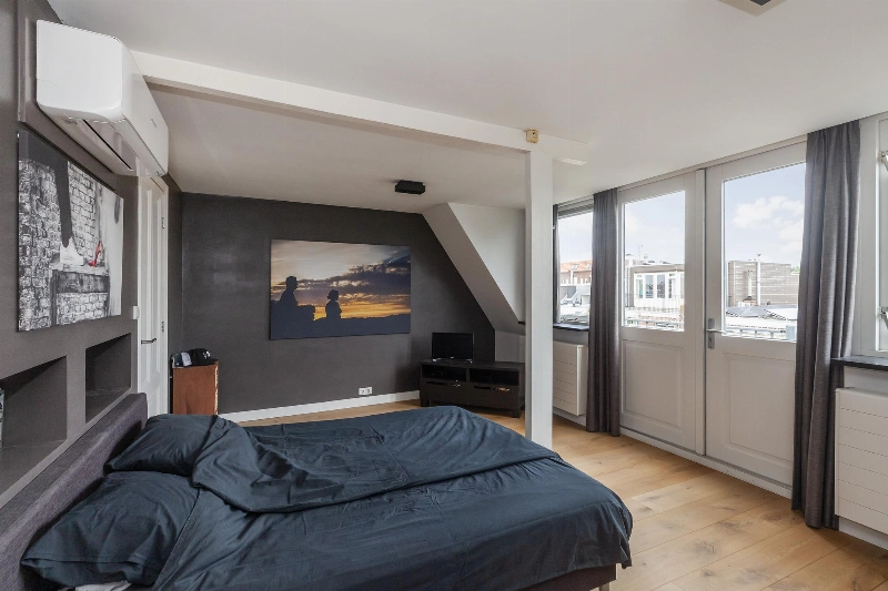 Deze ruime verdieping is ook weer licht en mooi afgewerkt met houten vloerdelen, gestucte wanden en een dakkapel aan de voorzijde. Aan de achterzijde ligt de masterbedroom voorzien van eiken vloerdelen, airco-unit en strak gestucte wanden en plafond. Vanuit de slaapkamer zijn er openslaande deuren naar het balkon (9 m²). Via deze slaapkamer loop je door naar de prachtige badkamer. Deze is voorzien van stucwerk in combinatie met antraciet grijze betegeling, een inloopdouche met regendouche, ligbad, zwevend toilet, radiator en wastafelmeubel. Afsluitend is er een 2e slaapkamer. Deze kamer is voorzien van een ruime inbouwkast en heeft ook een eigen toegang tot de badkamer.