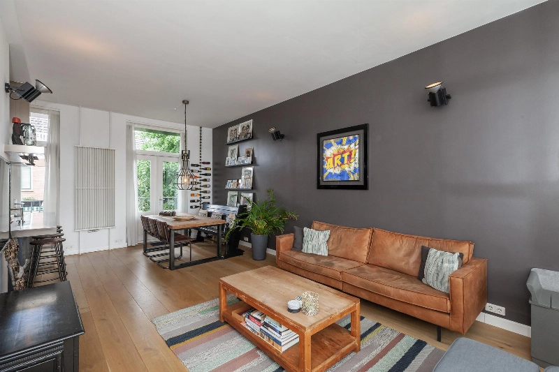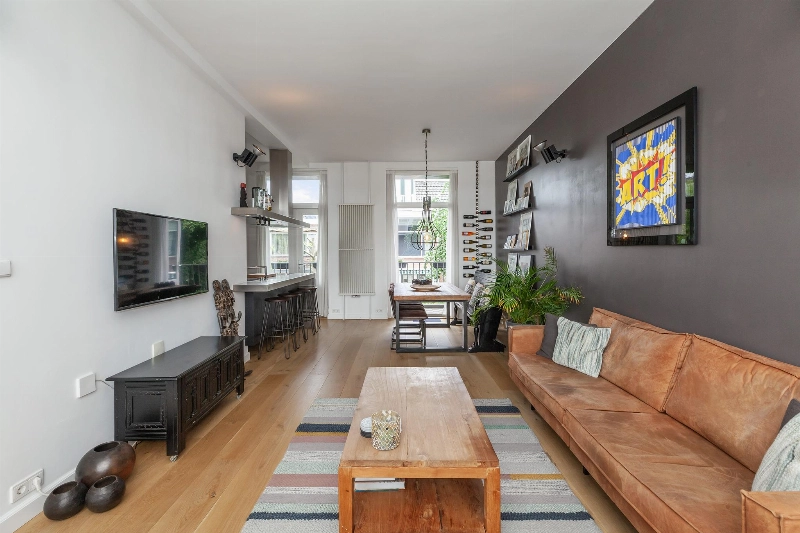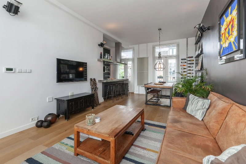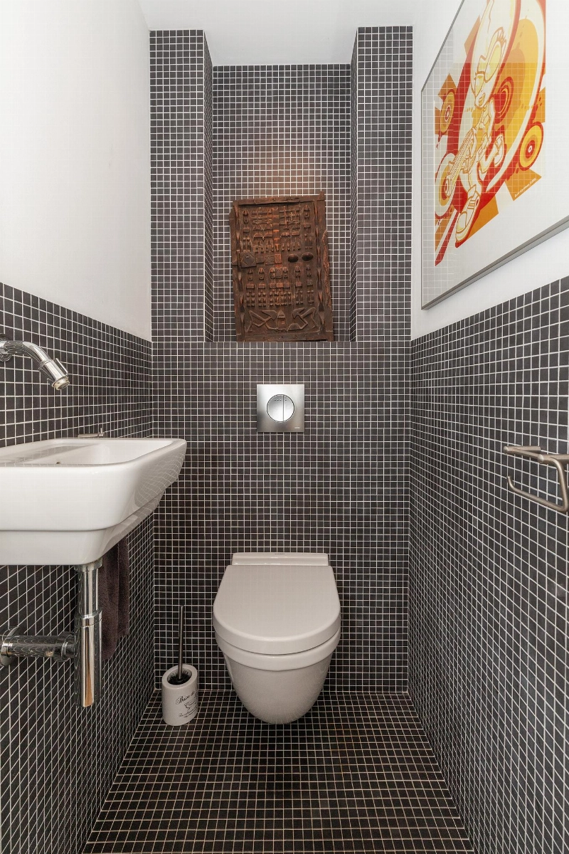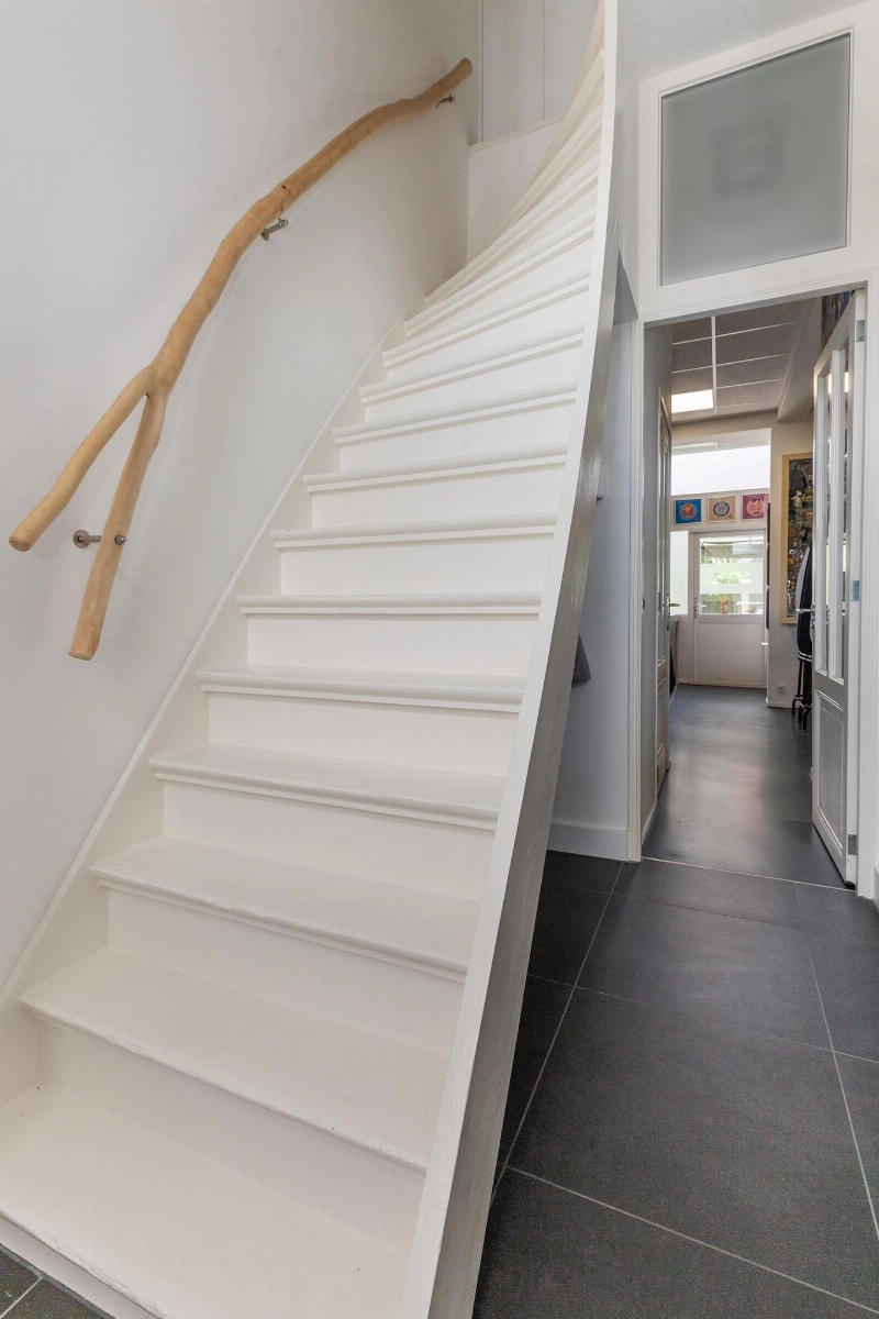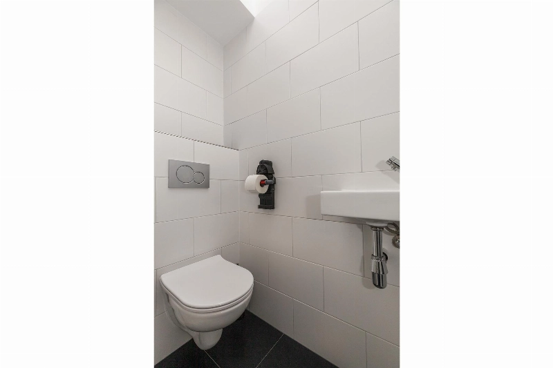 Via een gelakte houten trap met drijfhouten trapleuningen bereik je de overloop van de eerste etage. Hier vind je een modern betegelde toiletruimte met fraaie mozaïek betegeling, een zwevend toilet en fonteintje. Via de overloop bereik je de heerlijk lichte living met prachtige eiken vloerdelen, glad gestucte wanden en een plafond van 3.15m hoog. Wat een mooie kamer! Aan de voorzijde heb je vrij zicht op de straat.