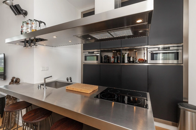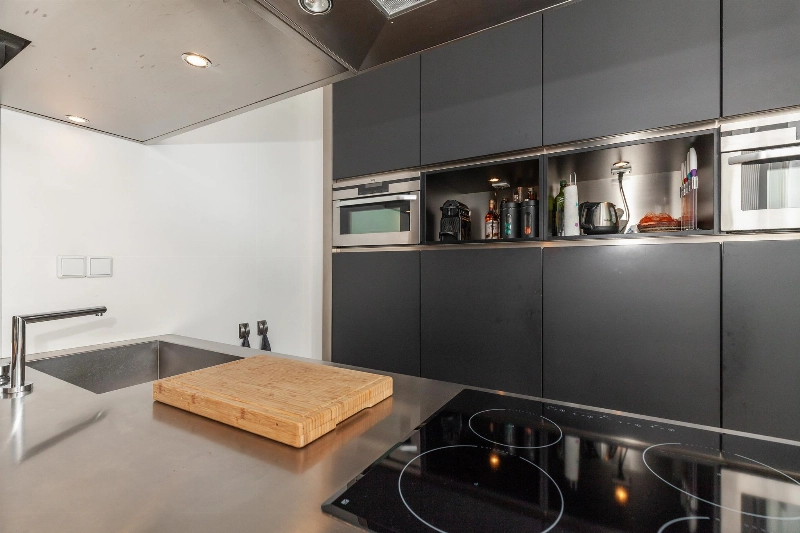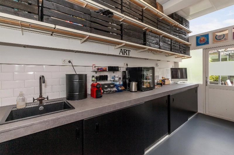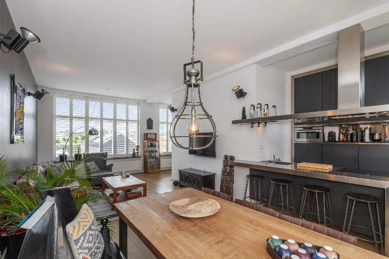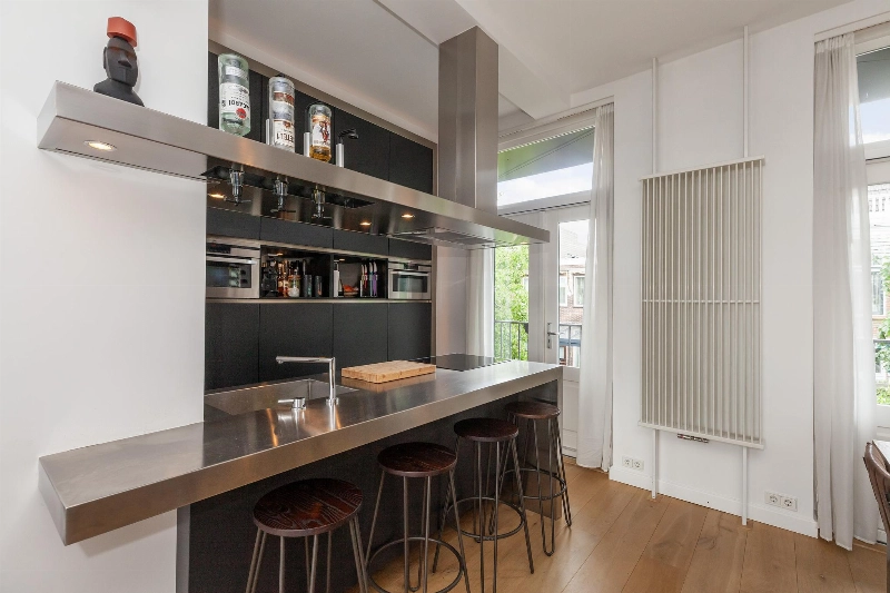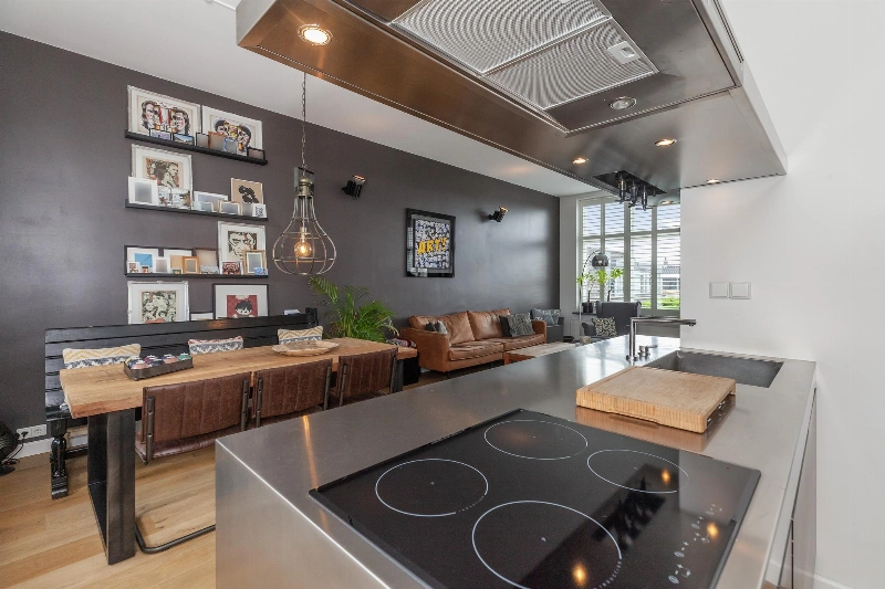 Aan de achterzijde ligt de open keuken met kookeiland met eetbar en is uitgevoerd met zwarte fronten en een RVS werkblad. Hier vind je alle apparatuur zoals koelkast, vaatwasser, vriezer, maar liefst twee combimagnetrons, inductiekookplaat, afzuigkap en spoelbak. De twee openslaande deuren geven je toegang tot het balkon van 9m² aan de achterzijde.