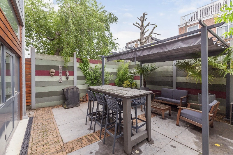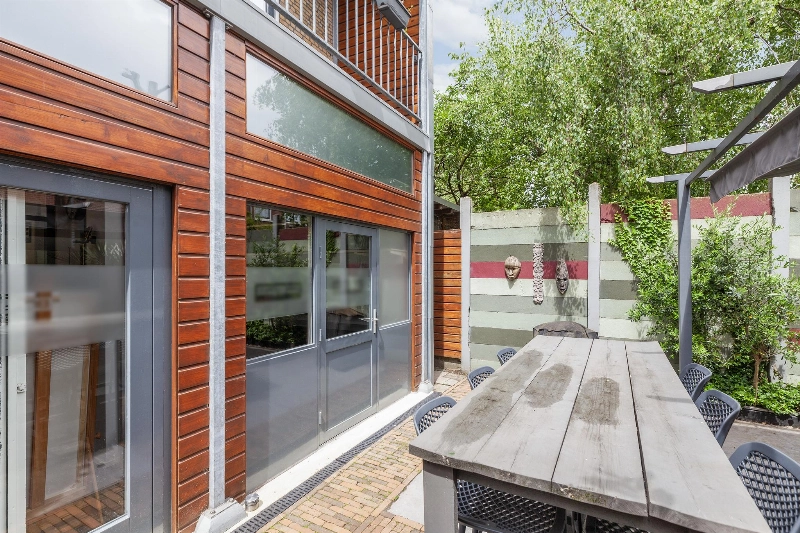 - De achterzijde op de begane grond heeft een glazen schuifpui;