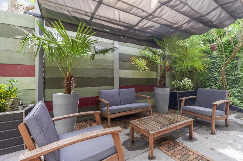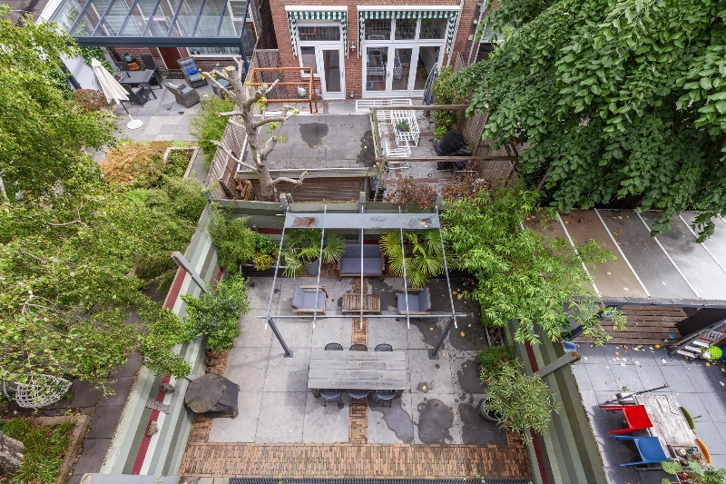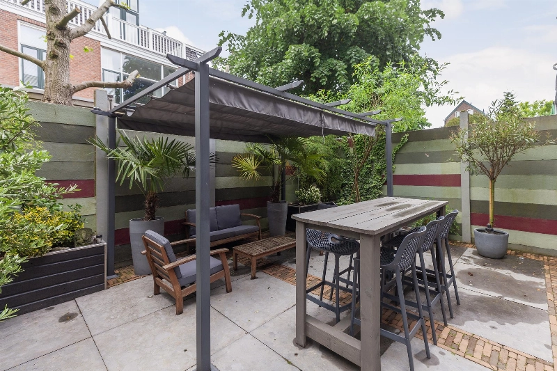 De onder architectuur aangelegde achtertuin van 40 m2 is gelegen op het oosten en is bereikbaar via de garage én via de naastgelegen steeg met eigen afgesloten toegang welke gedeeltelijk is overdekt voor bijvoorbeeld het stallen van je fiets.