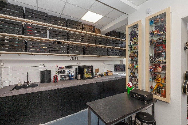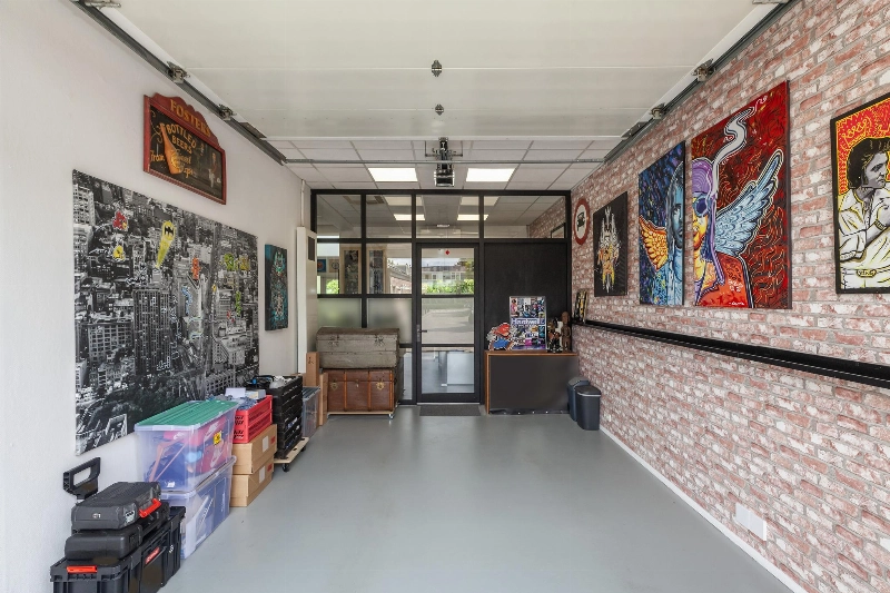 Entree met ruime hal met meterkast, trapopgang naar de woonverdieping en een garderobe met extra kastruimte. Aan het eind van de gang bereik je via een tussendeur de werkruimte. In deze fijne ruimte tref je een toilet en een 6,5 meter lang werkblad met kastruimte en aansluiting voor de wasmachine en droger. Dit is een fijne plek om te werken of als extra slaapkamer te gebruiken! De ruimte is geheel voorzien van een gecoate gietvloer en er is voldoende daglicht door de grote ramen en de mooie schuifpui. De garage is gelegen aan voorzijde en is ook voorzien van centrale verwarming en heeft een elektrische overheaddeur.