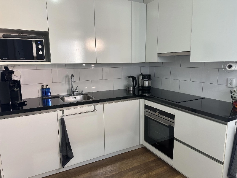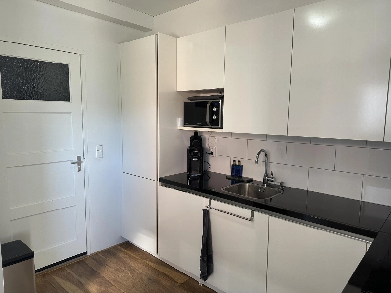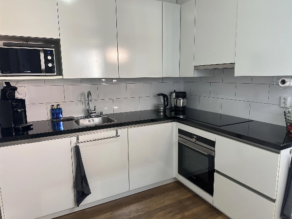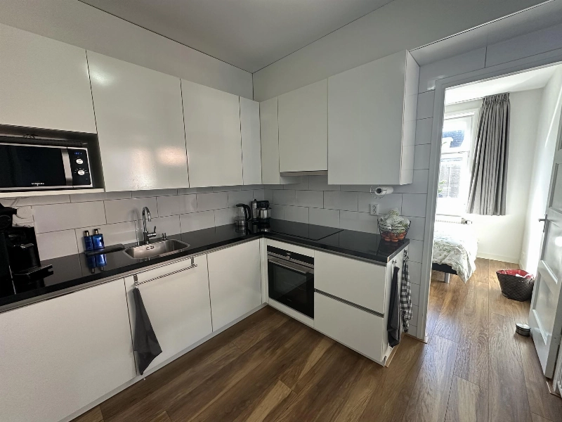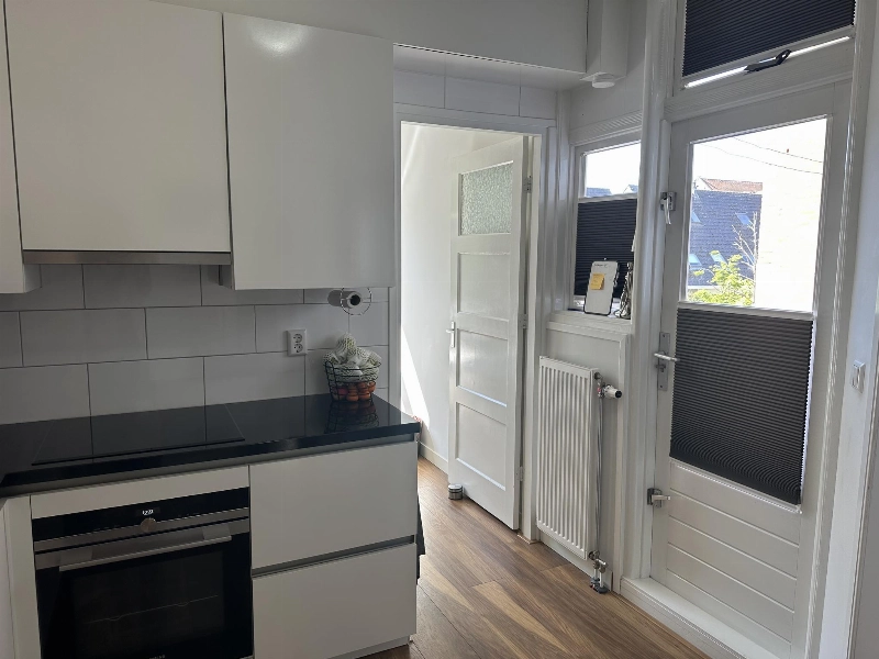 De moderne keuken is ruim van opzet en heeft een L-vormige witte inrichting met een composiet aanrechtblad. Verder is de keuken voorzien van een inductiekookplaat met vlakscherm afzuigkap, een koelkast, een vriezer, een vaatwasser en een combi-oven. De opstelling van de c.v. combiketel (Nefit 2024) is netjes in een keukenkastje weggewerkt.