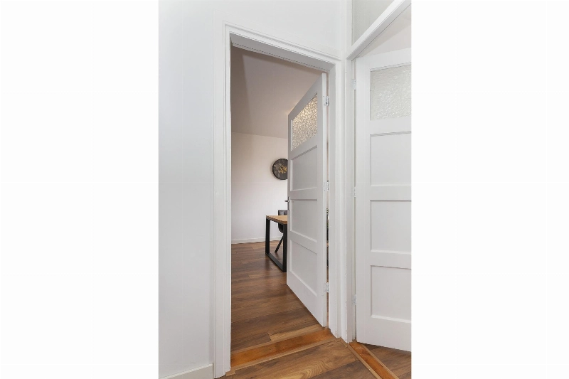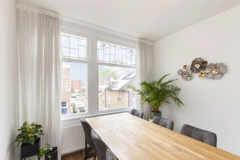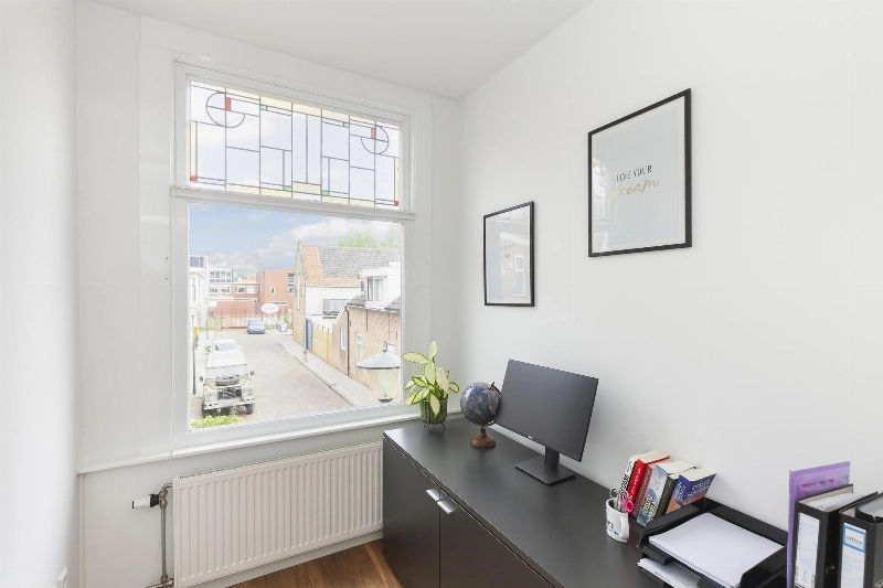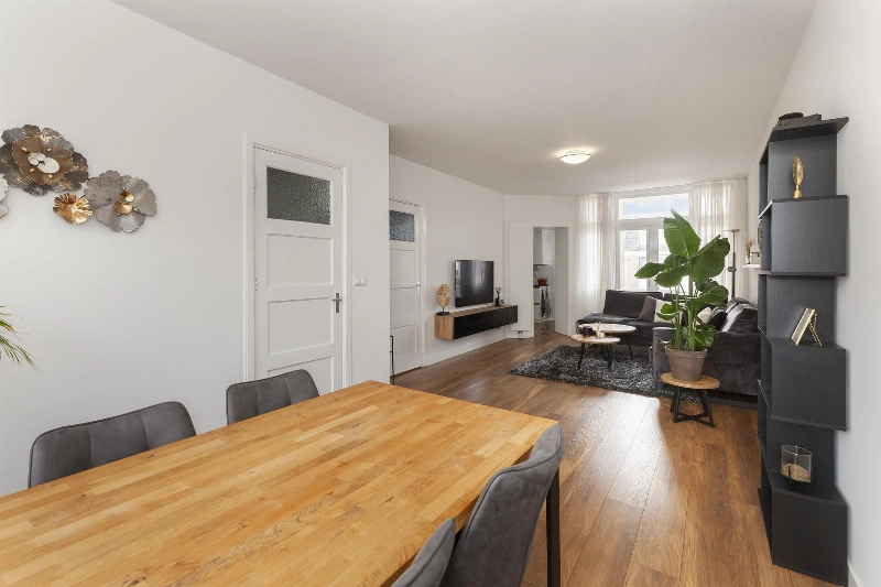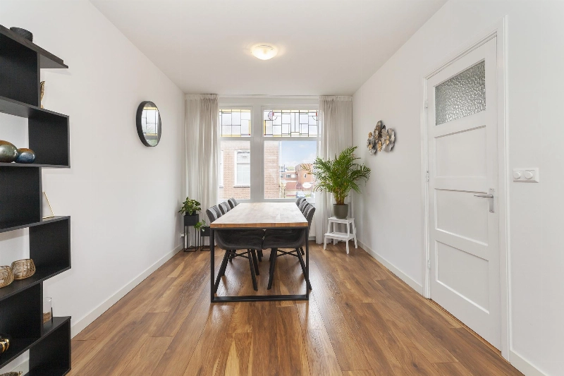 Mooie ruime doorzonwoonkamer met een fijne lichtinval door de grote ramen en het sfeervolle glas in lood. In de woonkamer bevindt zich een vaste kast met de aansluiting voor de wasmachine en via dubbel openslaande deuren heb je toegang tot het zonnige balkon.
