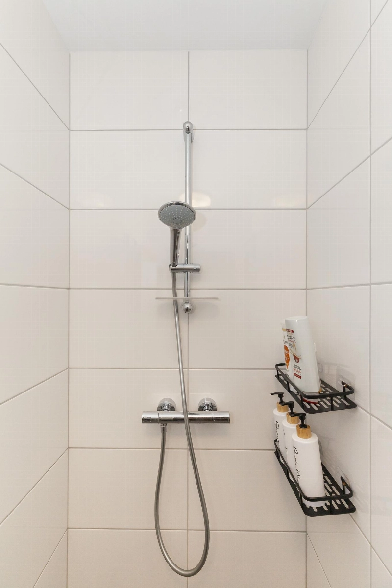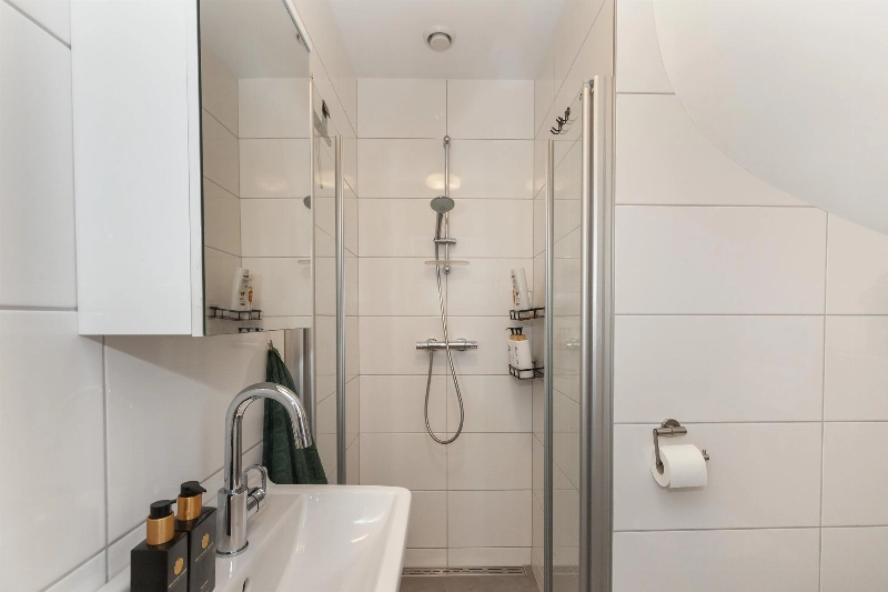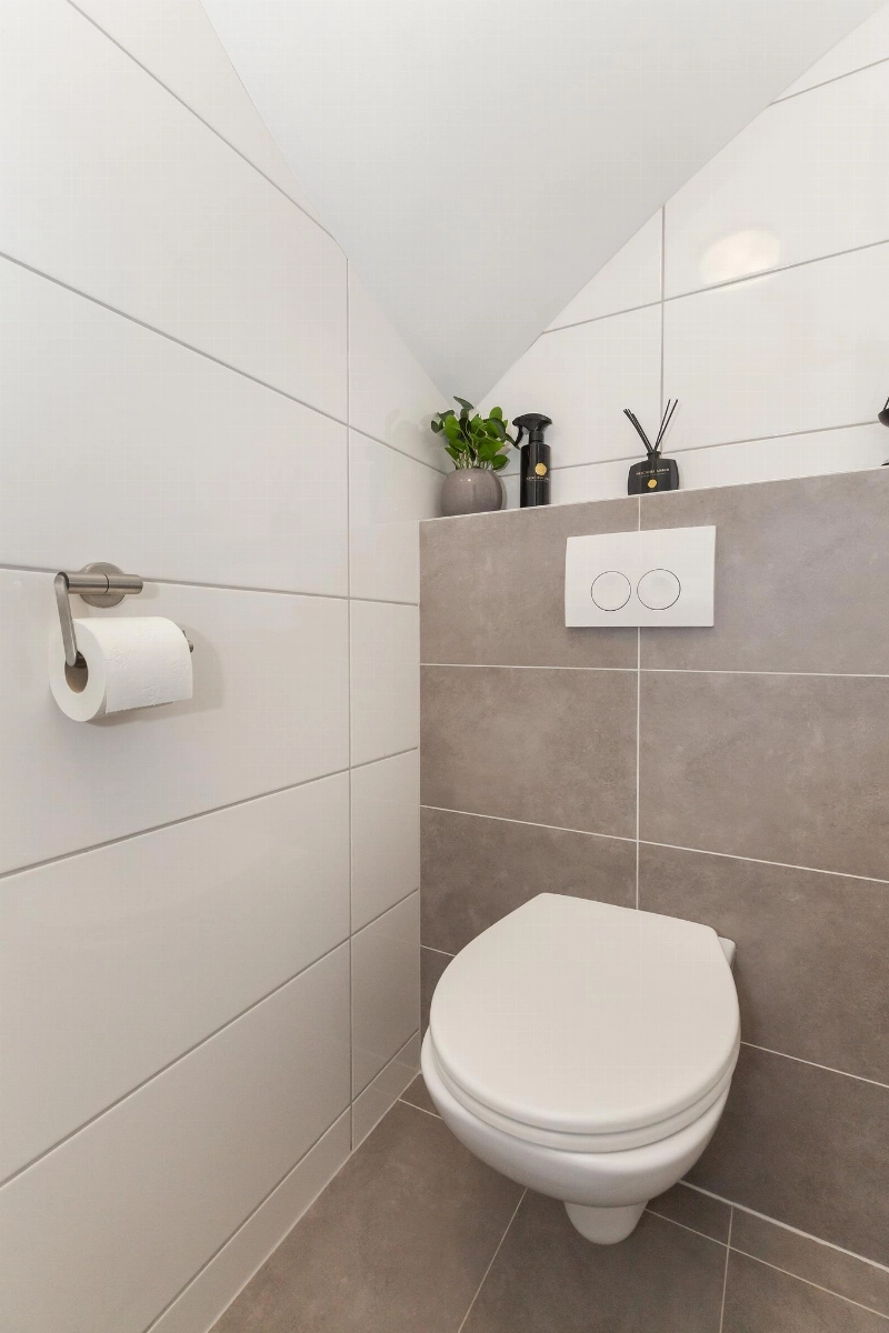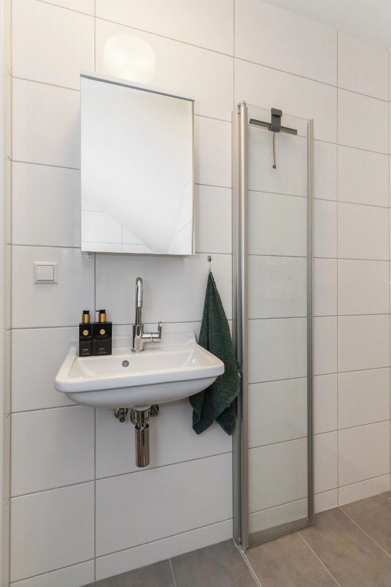 De volledige gemoderniseerde badkamer heeft grote witte wandtegels in combinatie met grijze vloertegels. De badkamer beschikt over een douchehoek met glazen deuren, een wastafel en een zwevend toilet.