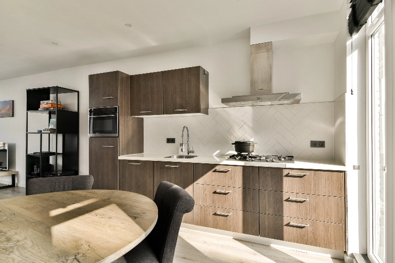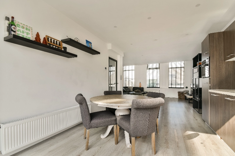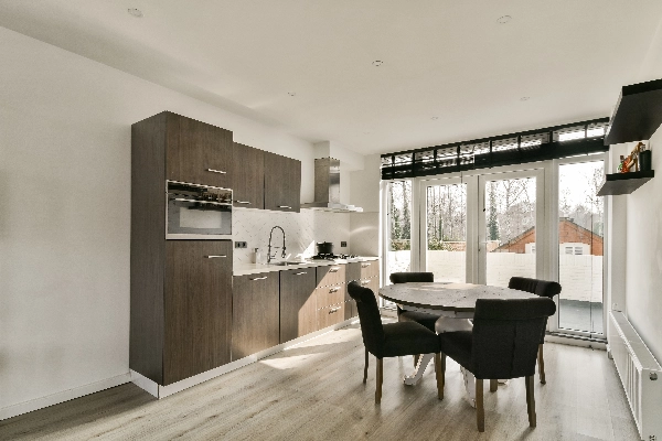 De woonkamer is heerlijk licht dankzij de grote raampartijen en heeft een strakke, moderne uitstraling met gestucte wanden en een lichte laminaatvloer. De open keuken vormt een mooi geheel met de woonkamer en heeft een stijlvolle houtlook afwerking. De keuken is compleet uitgerust met diverse inbouwapparatuur, waaronder een koelkast, vaatwasser, combi-oven, een 5-pits gaskookplaat en een RVS afzuigkap. De gezellige openslaande deuren geven toegang tot het zonnige dakterras van circa 3 meter diep en 5.50 breed.