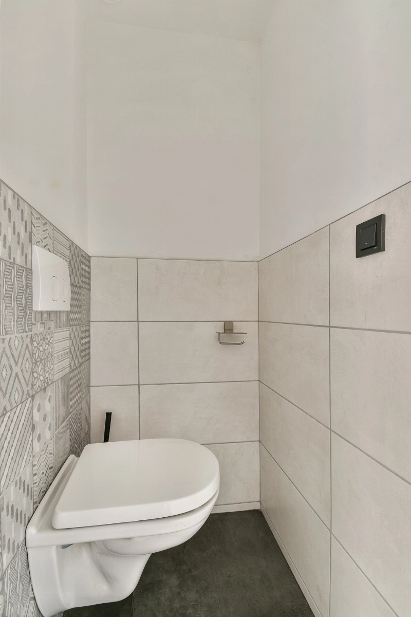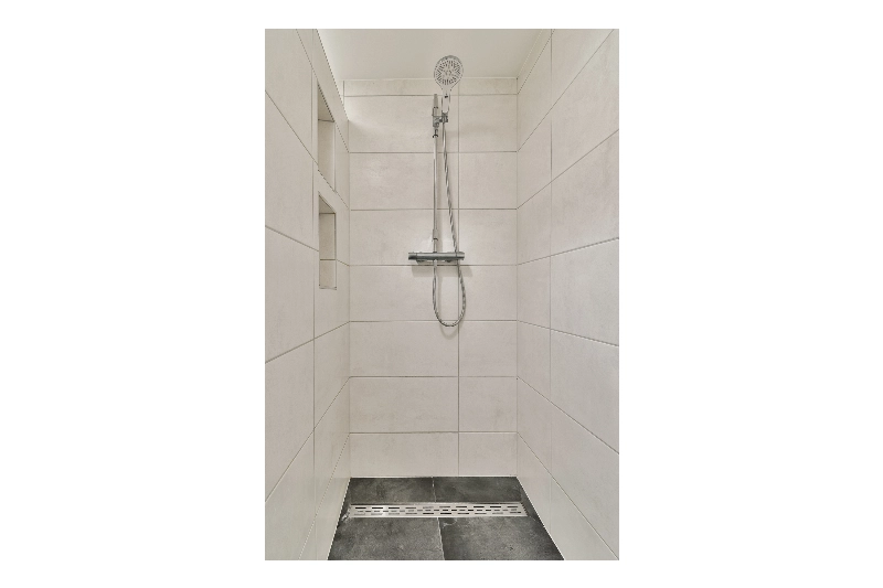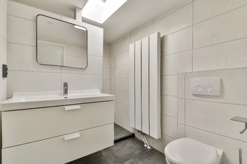 De moderne badkamer is stijlvol uitgevoerd met witte wandtegels en een grijze tegelvloer. De badkamer beschikt over een inloopdouche, een modern wastafelmeubel met spiegel, een zwevend toilet, een designradiator en een dakraam dat geopend kan worden voor natuurlijke ventilatie en extra daglicht.
