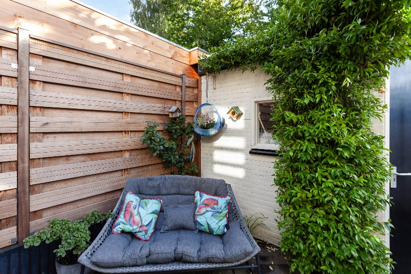 De zonnige achtertuin is een heerlijke plek om te ontspannen. Met een verhoogde vlonder aan het huis, een lager gelegen terrasgedeelte met een pergola, een stenen berging en een nieuwe schutting (2025) is het hier echt genieten in alle seizoenen.