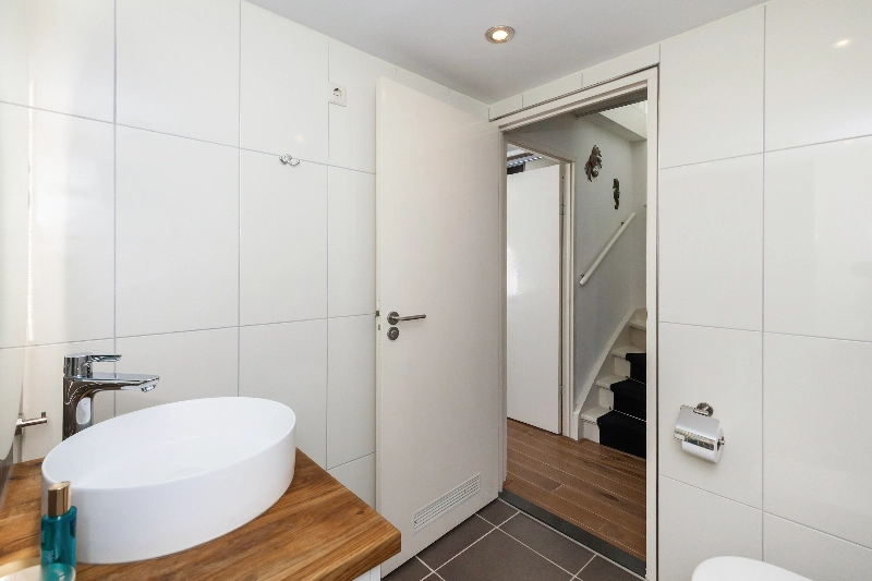 De modern toiletruimte is eveneens helemaal van nu met witte metro wandbetegeling, Portugese vloertegels met elektrische vloerverwarming, een zwevend toilet en een fonteintje.