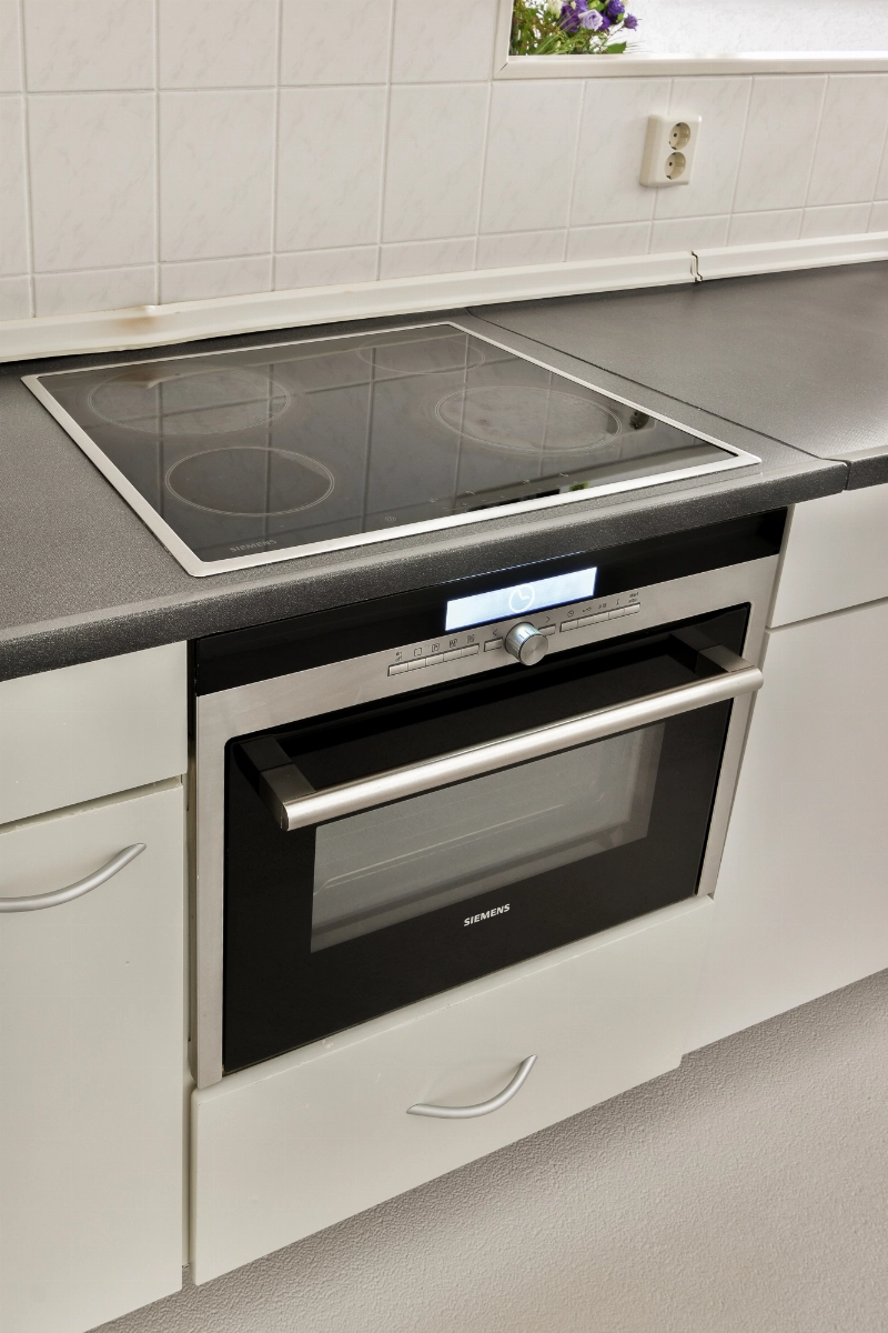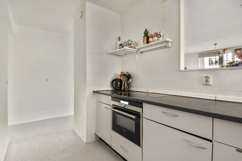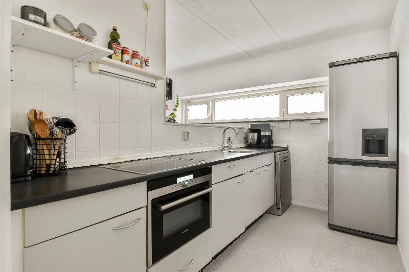 De keuken is afgewerkt met een witte, rechte opstelling voorzien van een elektrische kookplaat, oven, losse vaatwasser en een losse koel-vriescombinatie. Het werkblad is in kunststof afgewerkt en de achterwand is voorzien van achterwandbetegeling.