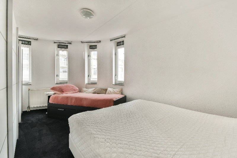 Slaapkamer I is voorzien van 4 ramen, vloerbedekking en een grote kastenwand.