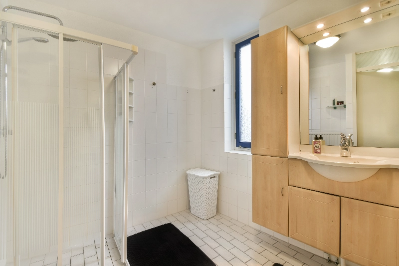 De ruime badkamer is voorzien van keurige witte betegeling met een houtlook wastafelmeubel, spiegelkast, inloopdouche met regendouche en opstelplaats voor de wasmachine en droger.