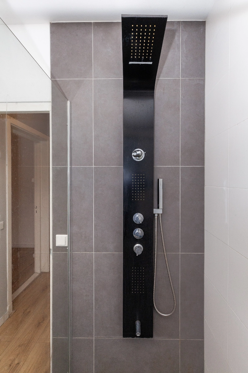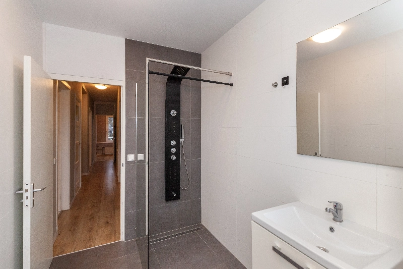 Badkamer is voorzien van stijlvol douchepaneel, designradiator en wastafelmeubel en geeft toegang tot het balkon.