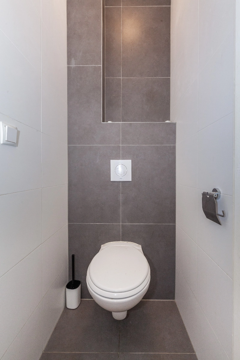 Separate toiletruimte welke voorzien is van wandcloset en geheel eigentijds betegeld.