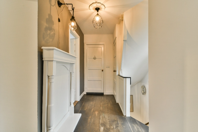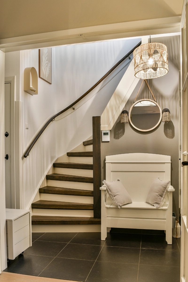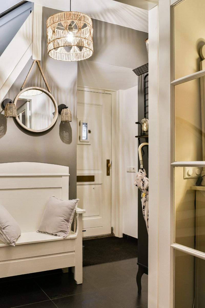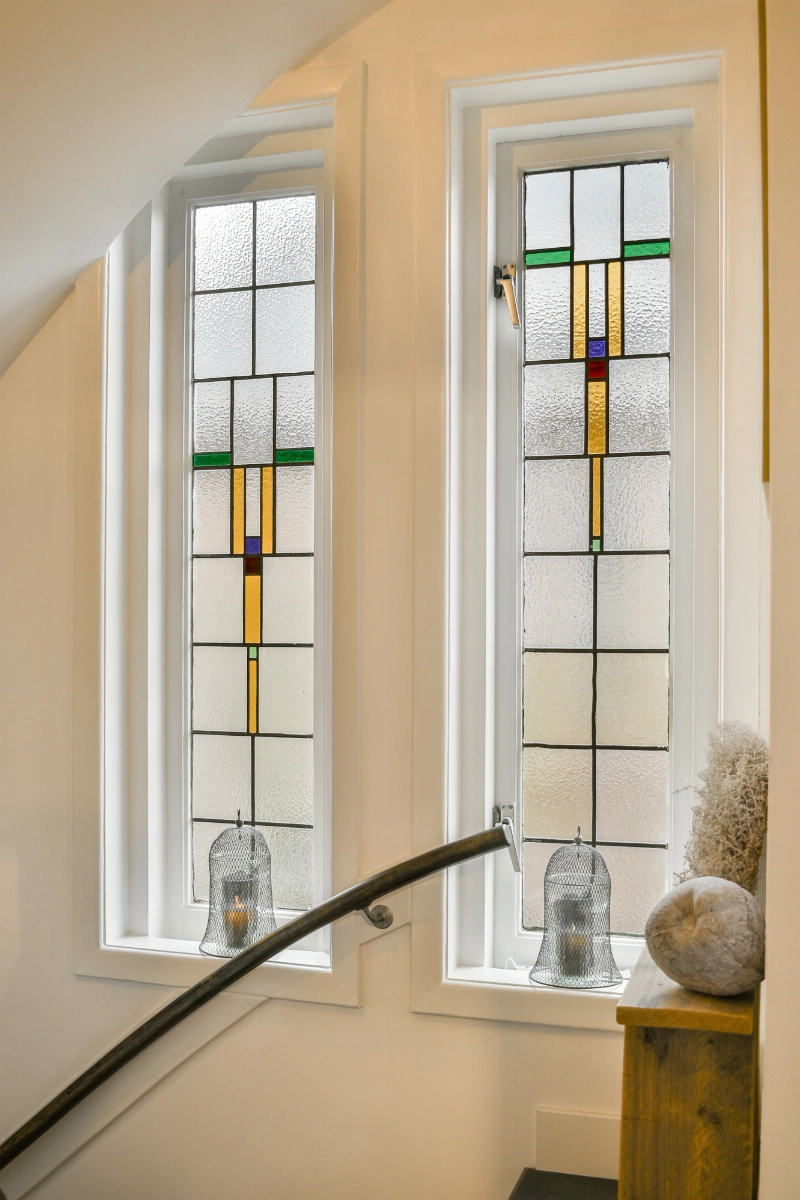 We gaan weer terug naar de woning en lopen naar de ontvangsthal. De trap naar de 1e verdieping is gerenoveerd met houten overzettreden en de zijramen zijn uitgevoerd met sfeervol glas-in-lood.