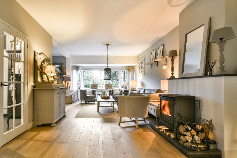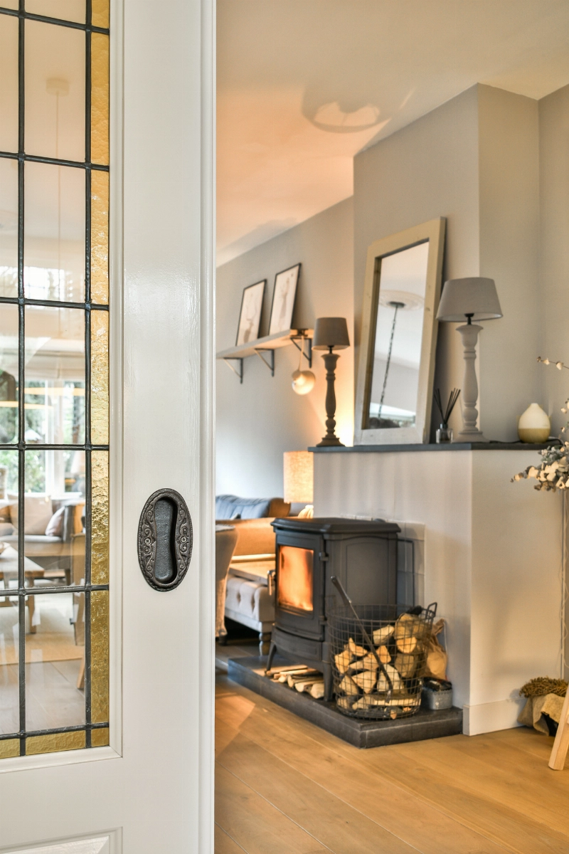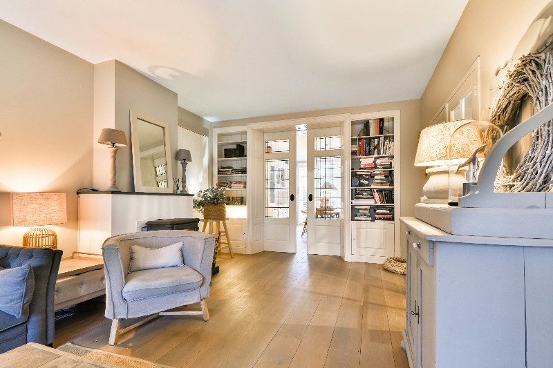 De woonkamer is voorzien van massief eiken vloerdelen en gestucte wanden. De houtkachel, de shutters, de sfeervolle erker en de open zijkamer met prachtig glas-in-lood maken deze ruimte helemaal af. Dit is een heerlijke ruime woonkamer die van de woonkeuken wordt gescheiden door een met de hand vervaardigde ensuite met glas-in-lood schuifdeuren.... een plaatje!