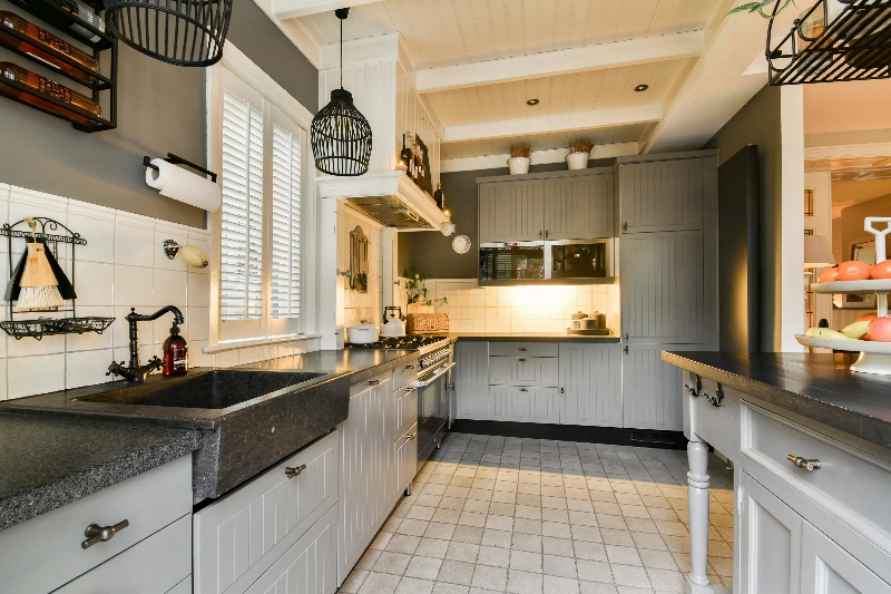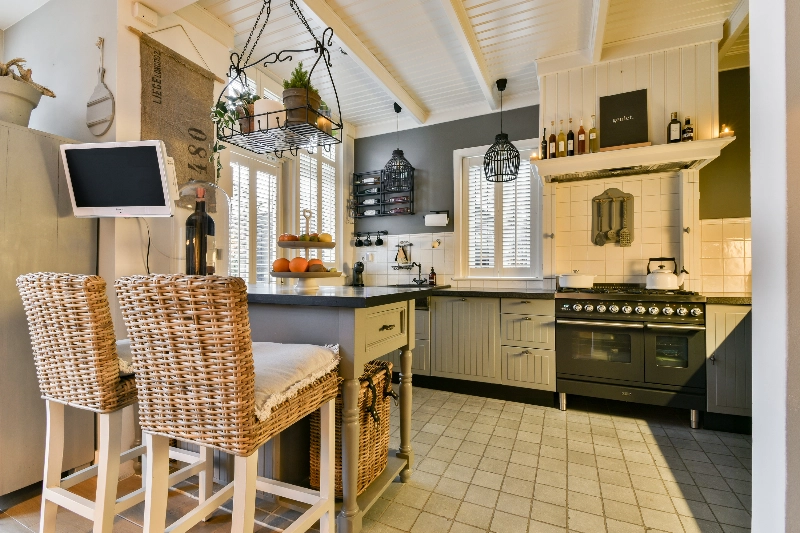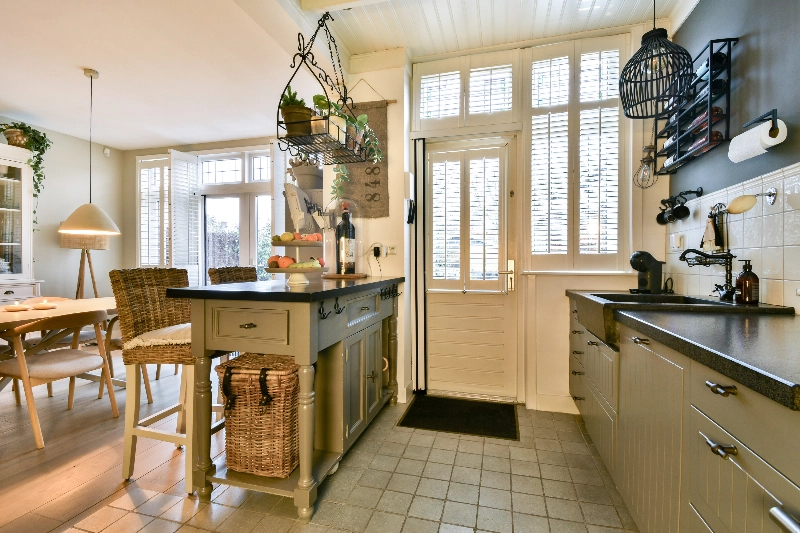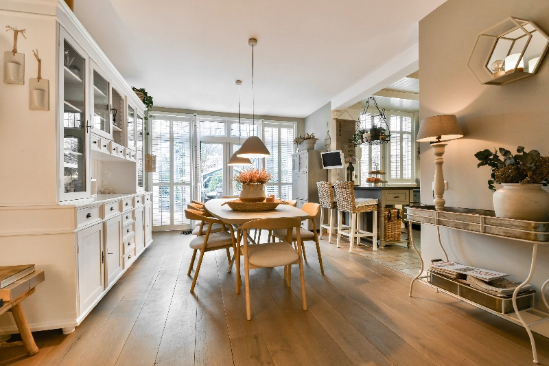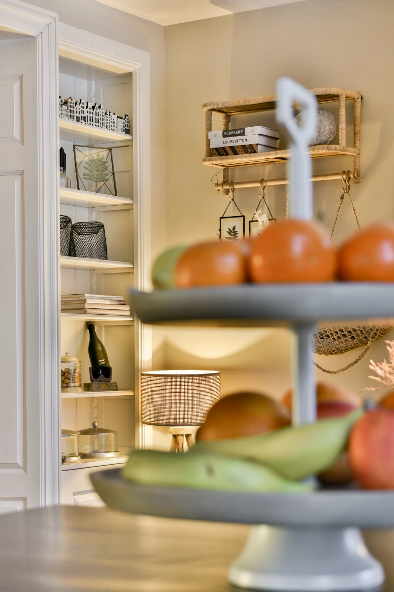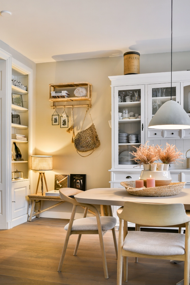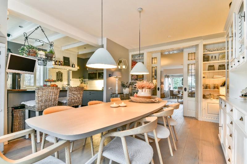 Achter deze prachtige ensuite bevindt zich de woonkeuken. De achterkamer heeft meer dan voldoende ruimte voor een grote eettafel; wat een fijne plek om tijd door te brengen met het gezin of vrienden! De open keuken grenst direct aan de eetkamer en heeft een landelijke hoekopstelling in zachtgrijze kleur voorzien van een prachtig Belgisch hardstenen aanrechtblad en spoelbak, Boretti kookstel met 6 pits gasfornuis en een dubbele oven, afzuigschouw, koffiemachine, magnetron, koelkast en vriezer. De bijpassende eetbar sluit mooi aan bij het geheel en zorgt voor extra bergruimte.