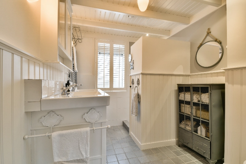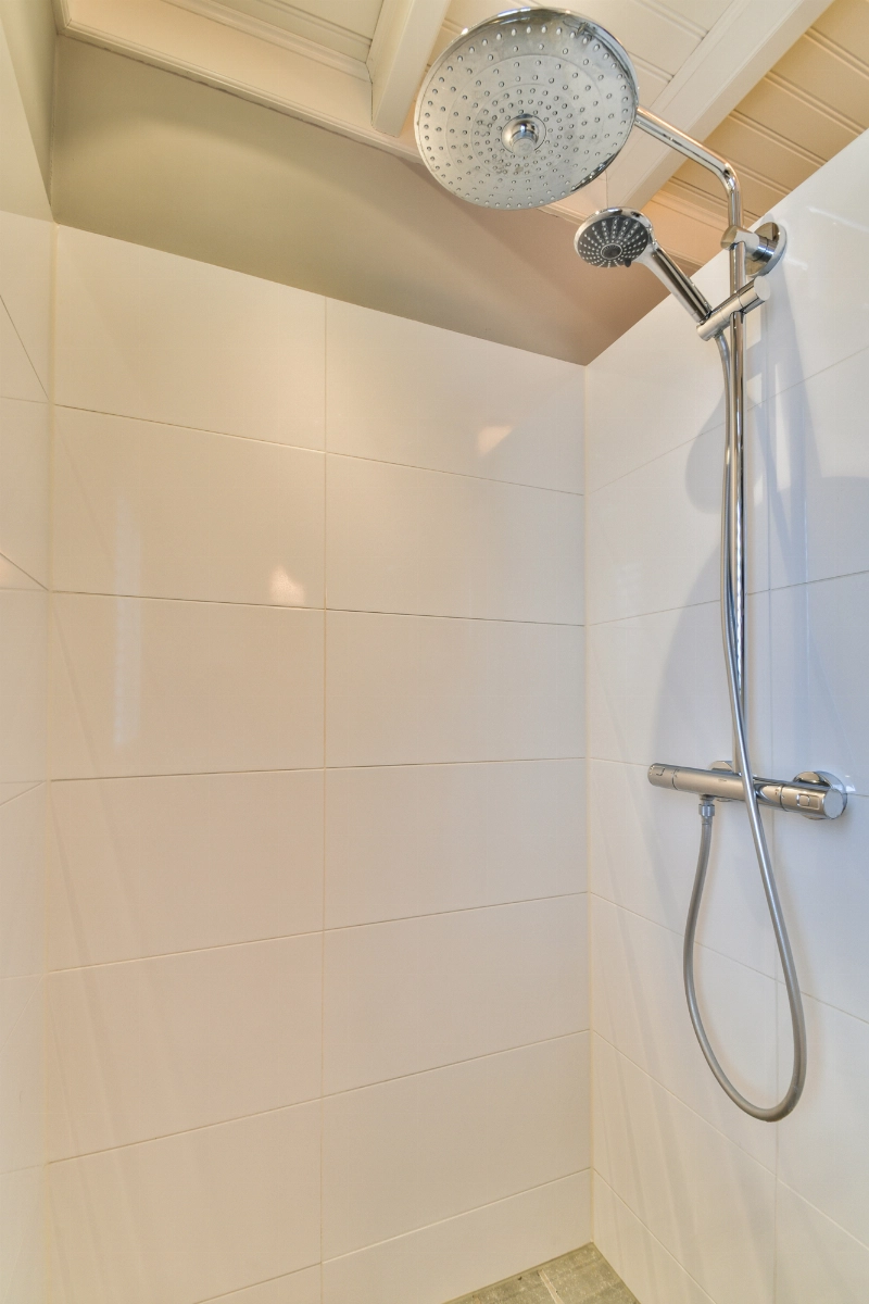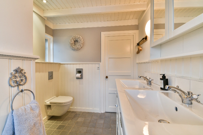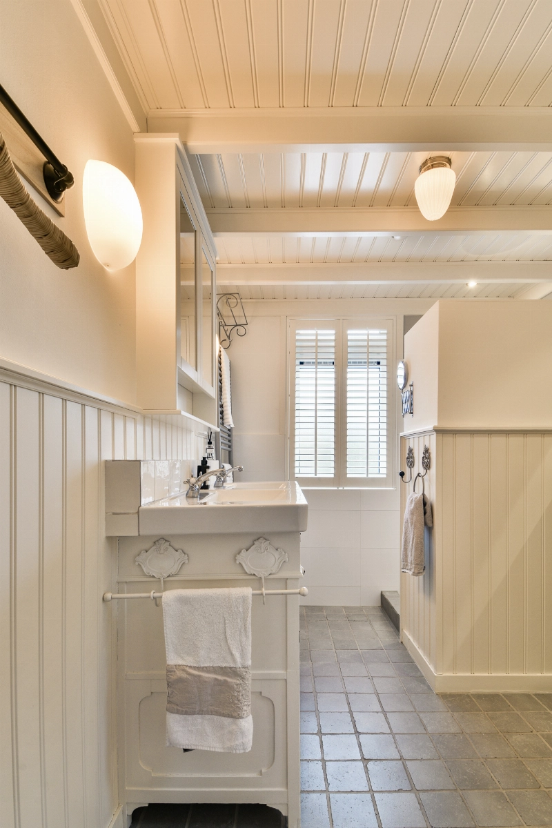 De badkamer is voorzien van vloertegels met vloerverwarming, houten wandafwering met kraaldelen, een sfeervol wastafelmeubel met dubbele wastafel, kastje met spiegel, 2e toilet en een betegelde douchehoek. Het kozijn is in kunststof uitgevoerd.