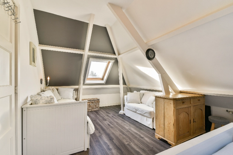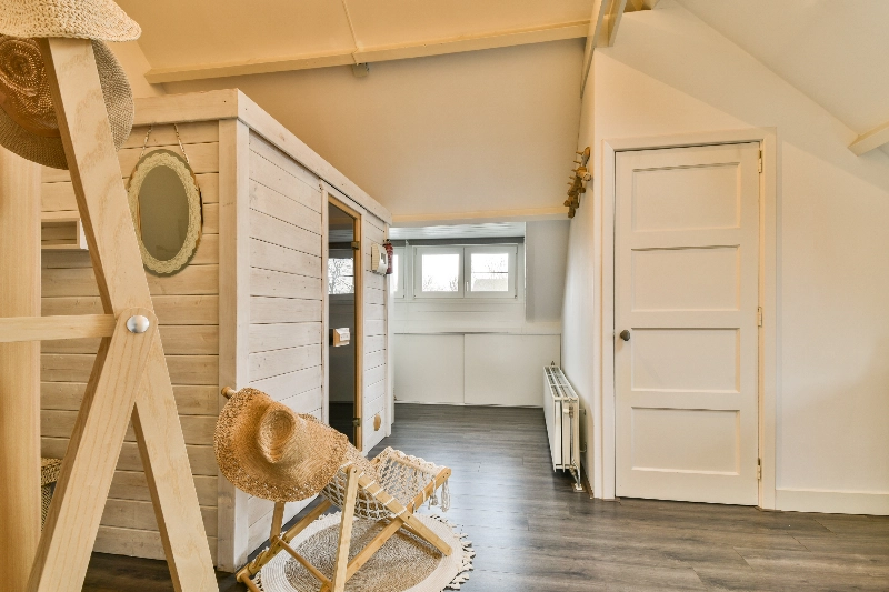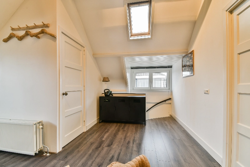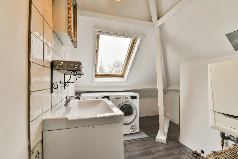 Op zolder vind je veel bergruimte achter de schotten en er is een aparte was-stookruimte met wastafelmeubel en een dakraam.