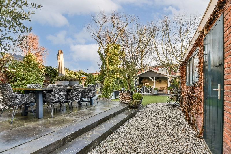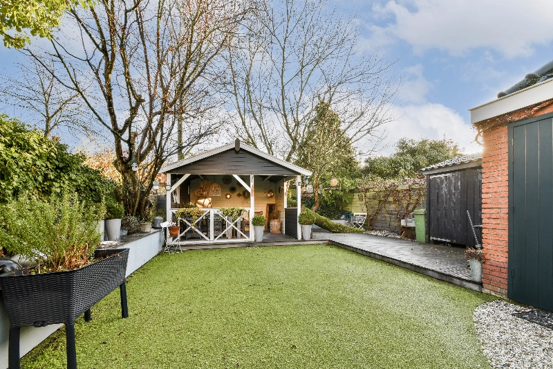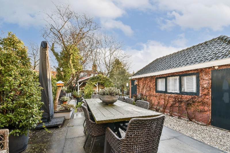 Op een mooie dag geniet je van de heerlijke diepe achtertuin en het tuinhuis. Het vele groen in de zomer geeft privacy.