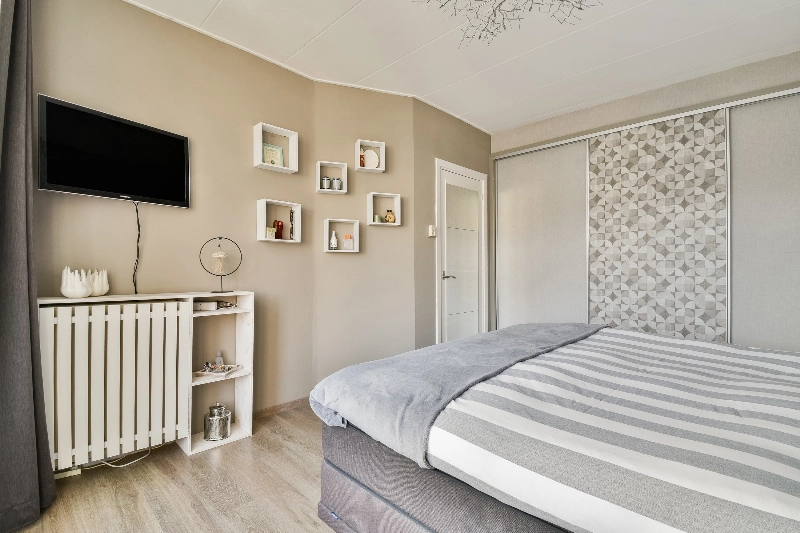 Slaapkamer III met vaste kasten wand is gelegen aan de achterzijde en is zeer ruim te noemen! (ca. 4.34x 3.19/3.52m) Vanuit deze slaapkamer is via de openslaande deuren het overdekte balkon toegankelijk.