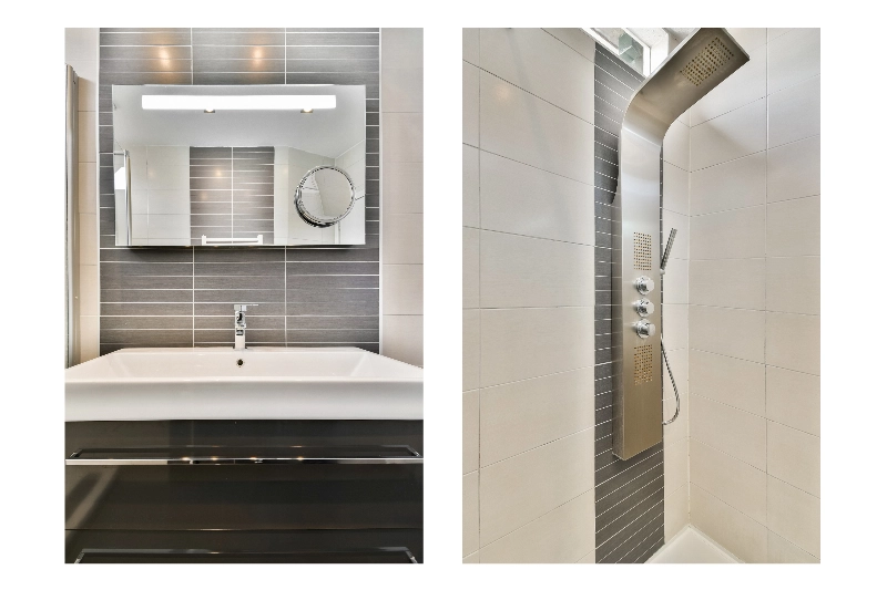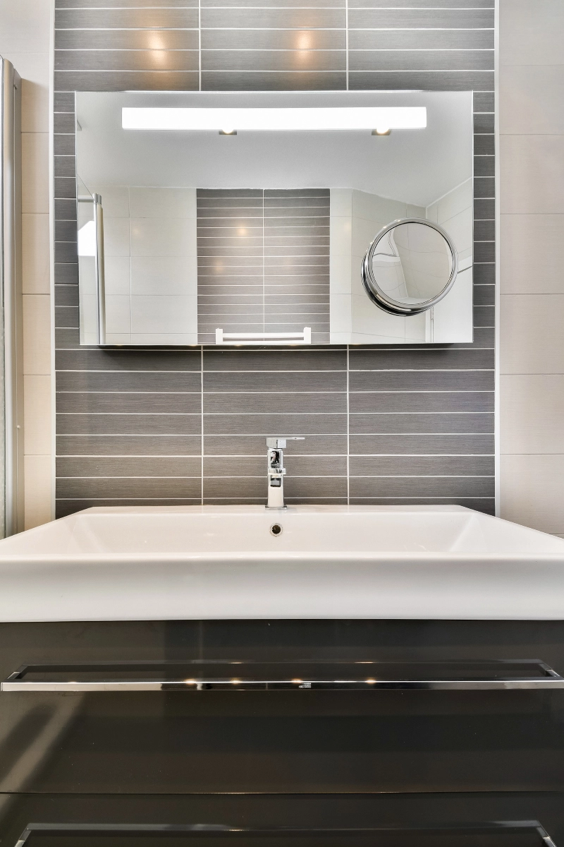 De moderne badkamer is uitgevoerd met grijs/witte betegeling en heeft een ruime inloopdouche met een stortdouche, een modern wastafelmeubel met lades en een spiegel met verlichting.