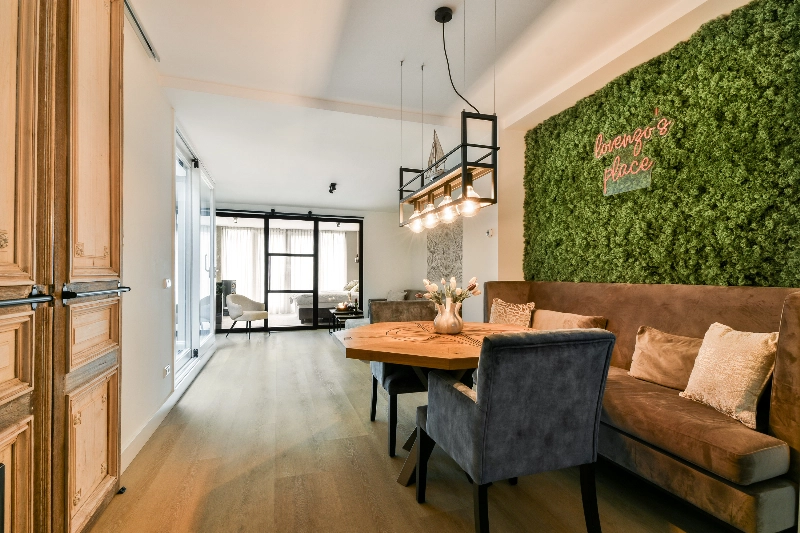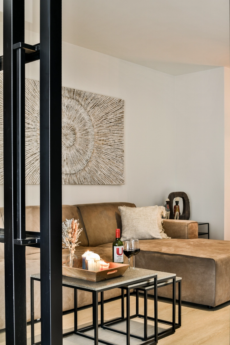Aansluitend ligt de sfeervolle woonkamer, die grenst aan een knusse patio. Deze buitenruimte zorgt ook voor extra daglicht. Het gehele appartement is afgewerkt met een mooie houtlook pvc-vloer met vloerverwarming, wat zorgt voor comfort en een warme uitstraling.